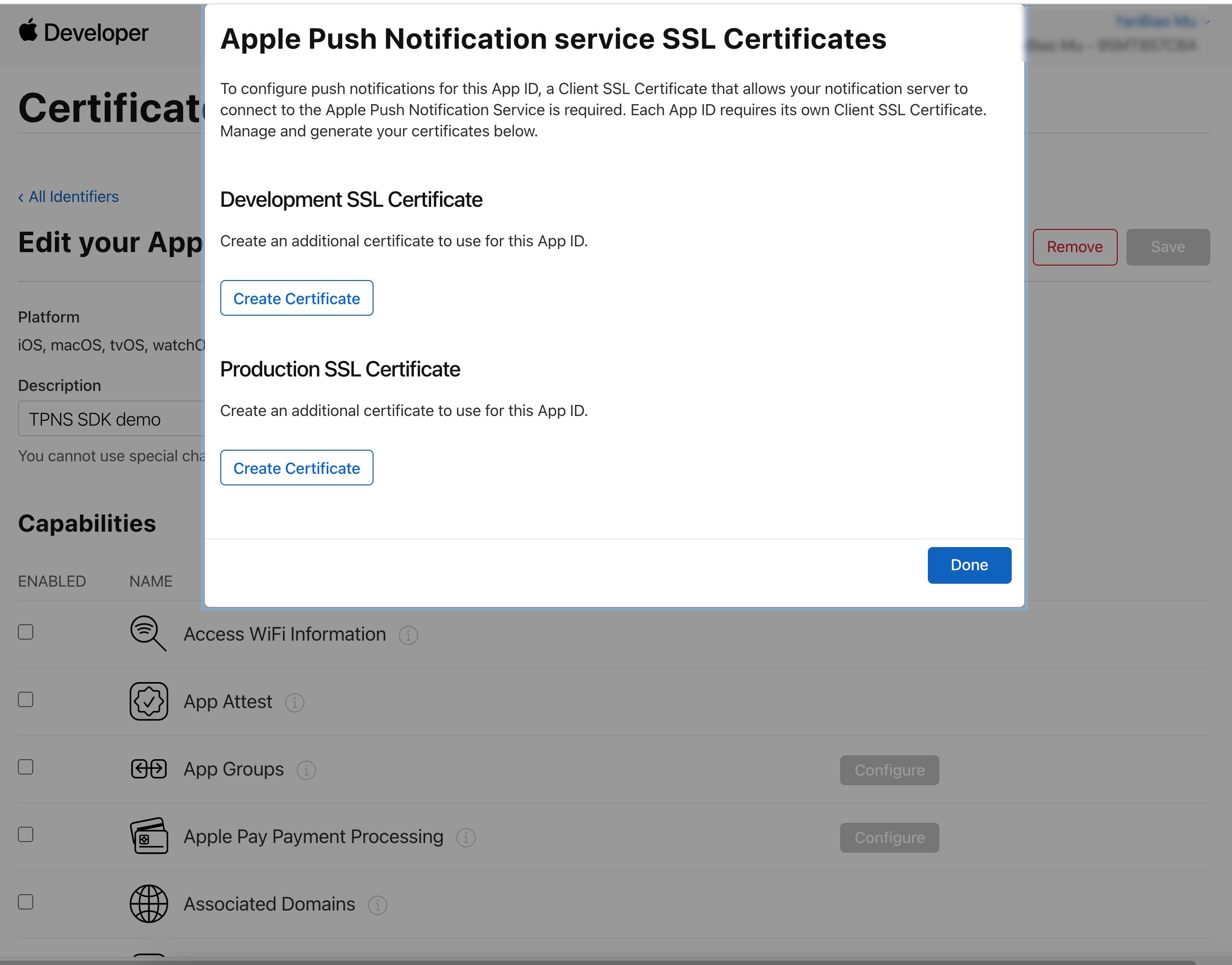 2. In the Apple Push Notification service SSL Certificates section, you'll see two SSL Certificate entries: one for Development, one for Production.