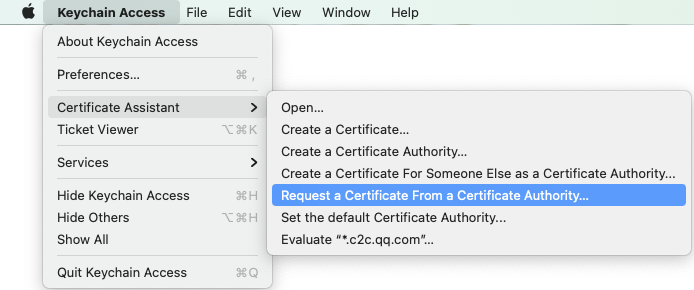 4. On your Mac, open Keychain Access and select Keychain Access > Certificate Assistant > Request a Certificate From a Certificate Authority.