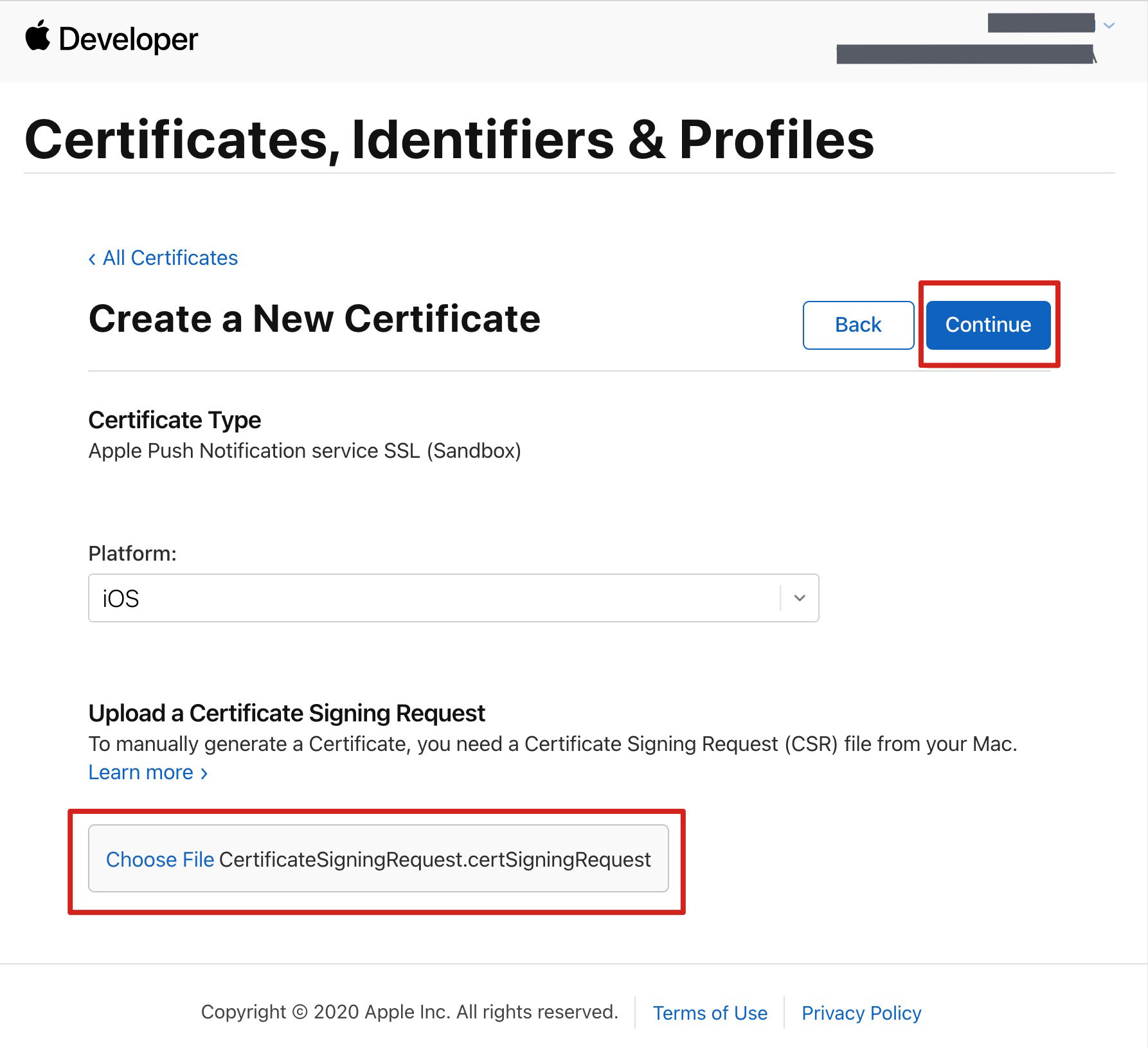 6. Return to the Apple Developer website, click Choose File to upload the generated *.certSigningRequest.