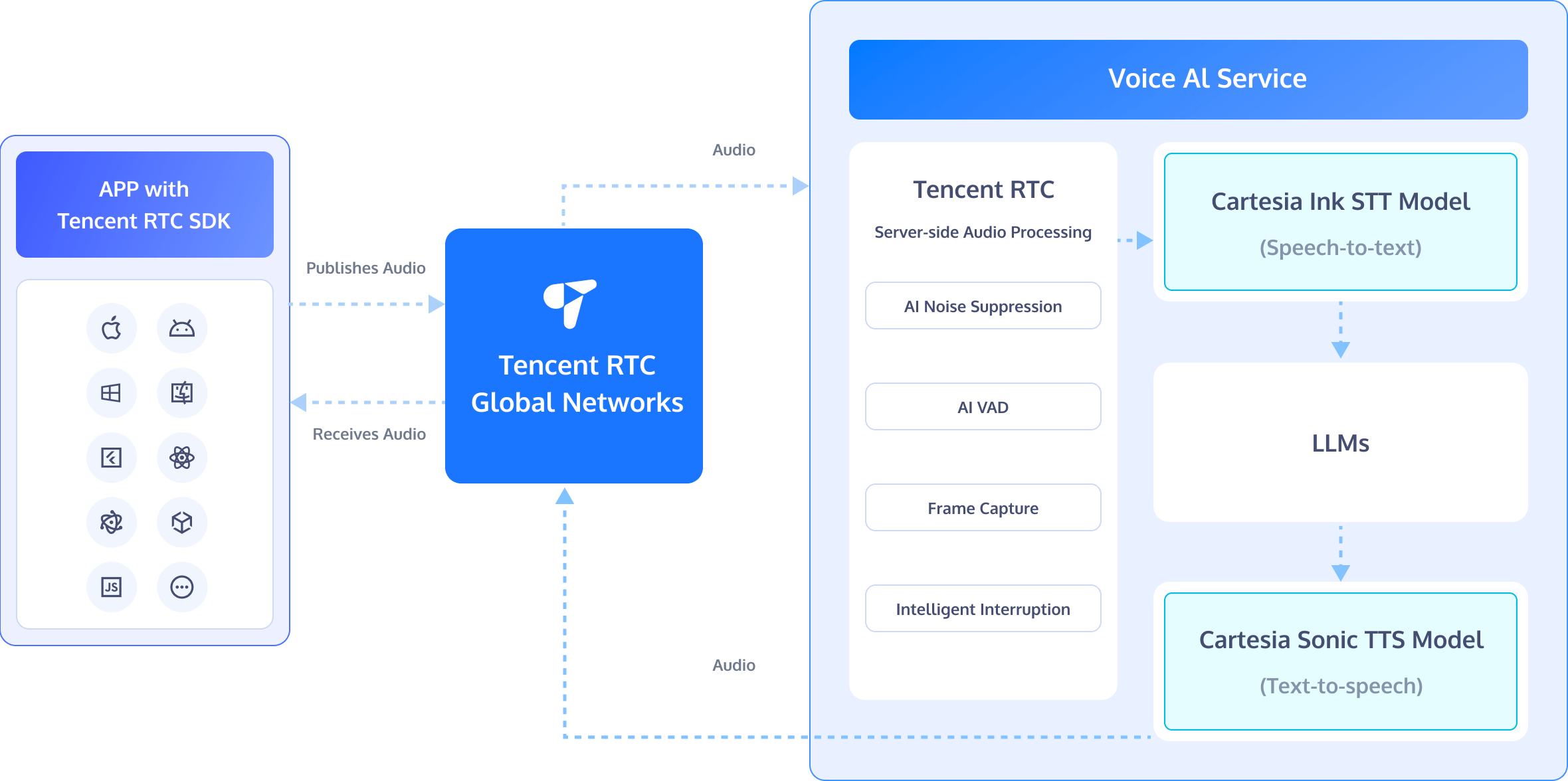 Combines Cartesia Sonic’s industry-leading millisecond TTFA with Tencent RTC’s sub-300ms network latency for a seamless “Speak-and-Hear” experience.