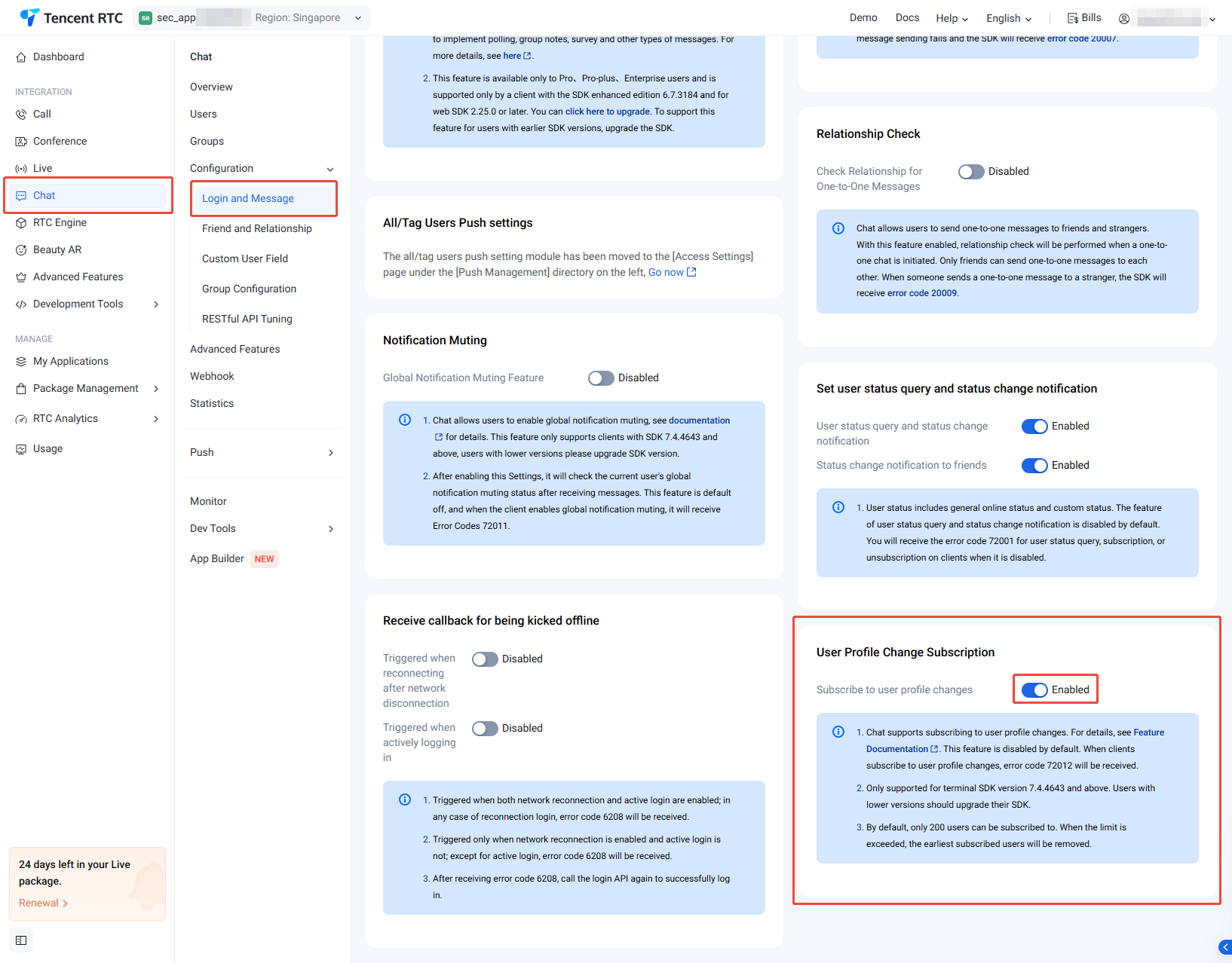 若需要开启用户资料变更后回调,需首先在 Chat > Configuration > Login and Message 里打开用户资料变更订阅开关。
