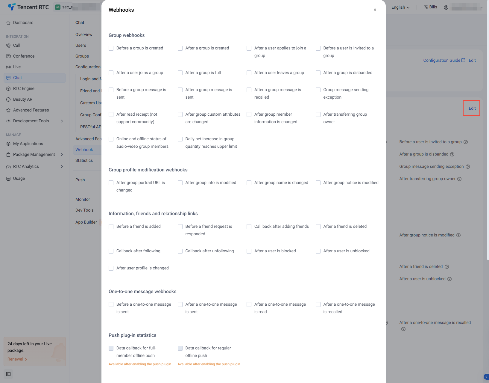 1. 回调配置页面,单击第三方回调配置区域的编辑。在弹出的编辑弹窗选择要配置的功能。