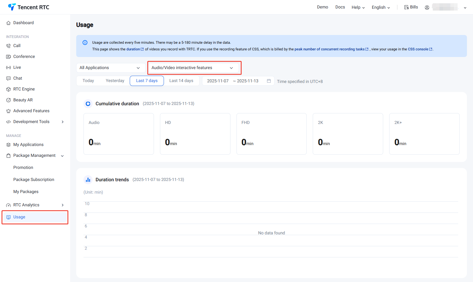 1. 进入 Tencent RTC 控制台 > Usage,选择音视频互动功能。