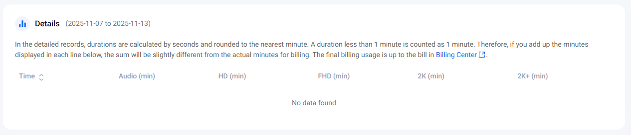 实时音视频控制台的音视频互动用量统计,支持查看已创建应用消耗的详细用量数据。