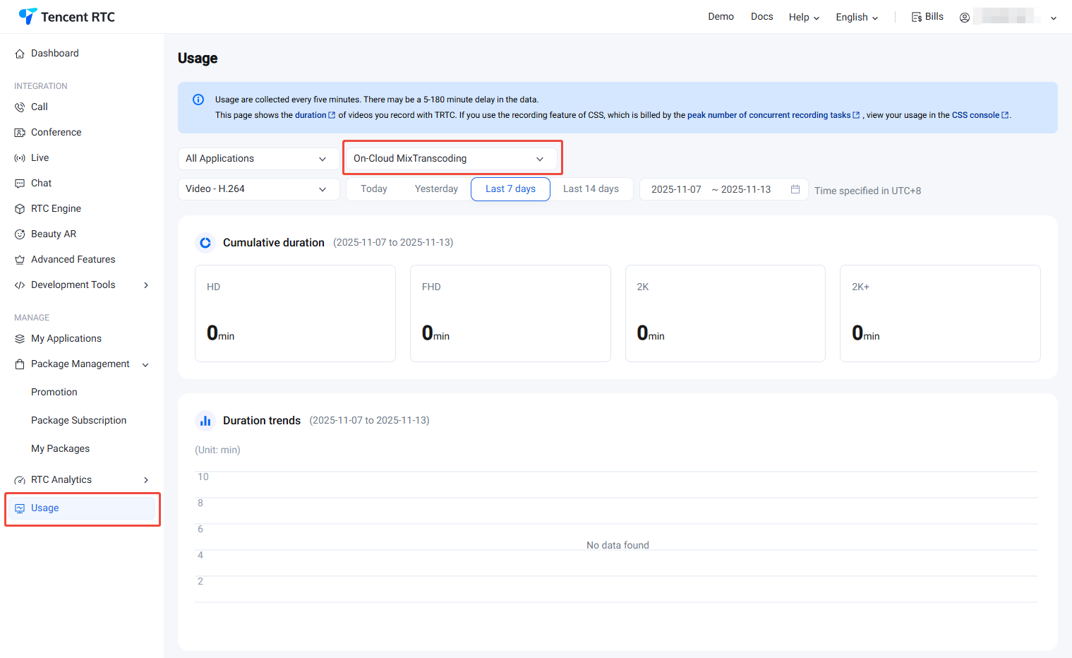 实时音视频控制台的云端混流转码用量统计,主要用于展示 TRTC 提供的