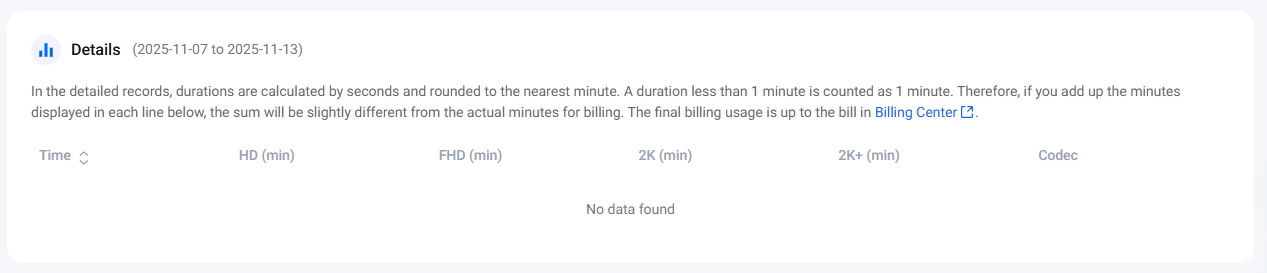 流水显示数据以秒计算,再按分钟取整,不足1分钟计为1分钟。因此若将以下每行流水显示的分钟数直接相加,将与实际结算分钟数略有差异。最终计费用量以