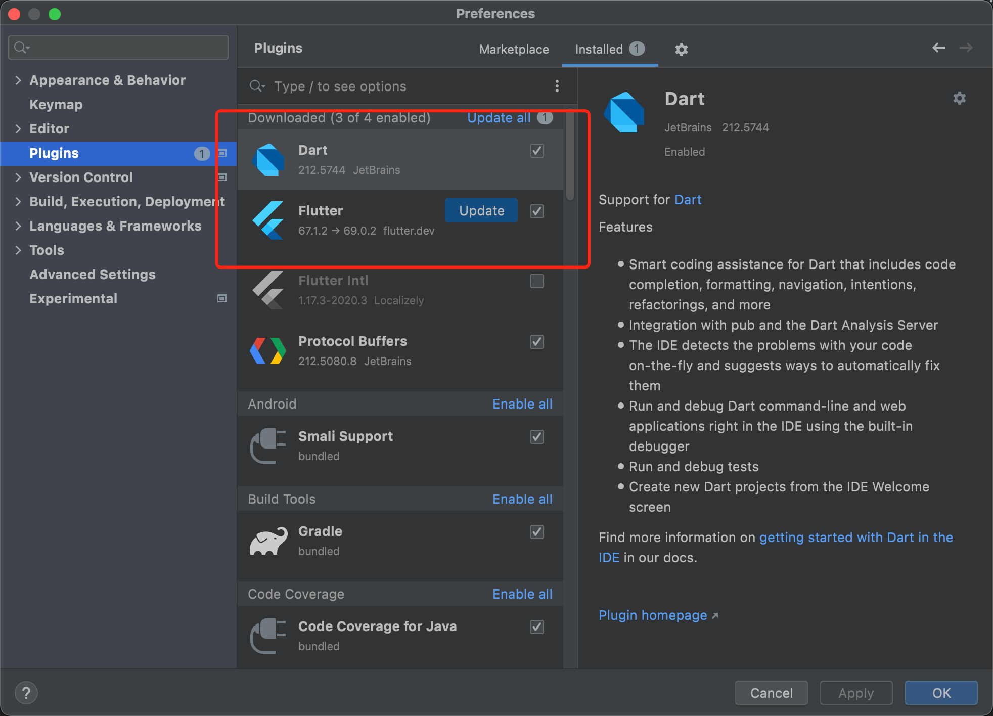 用 Android Studio 导入工程,并安装 Flutter 和 Dart 插件。