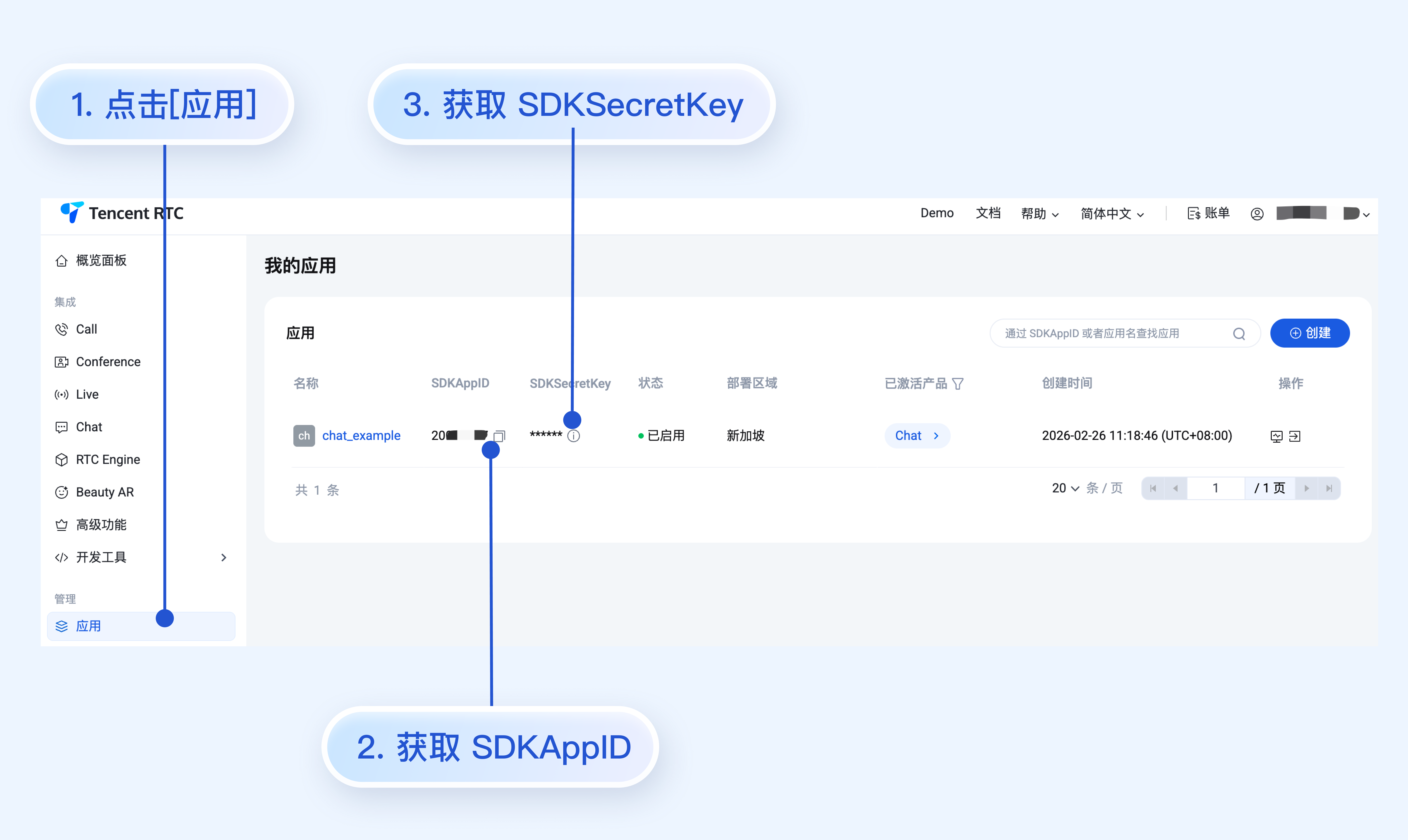 1. 登录控制台。如果您已有应用,请记录其 SDKAppID 和密钥信息。