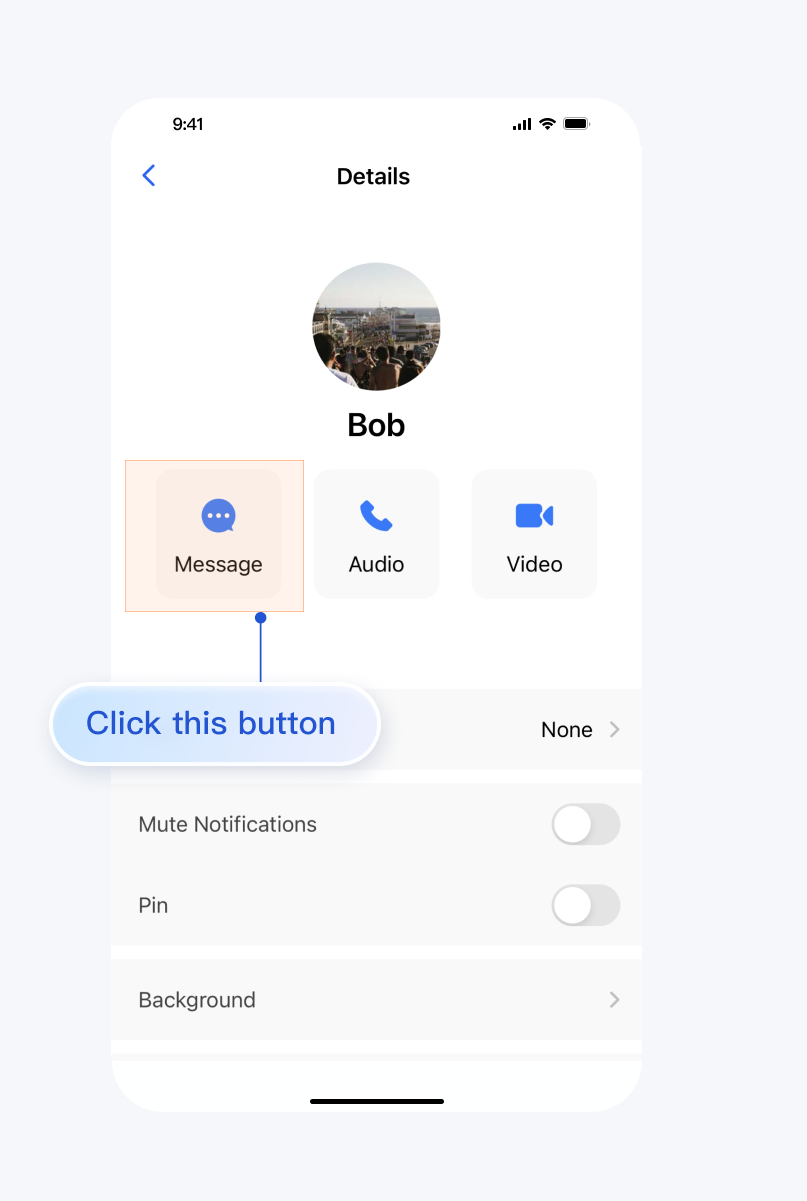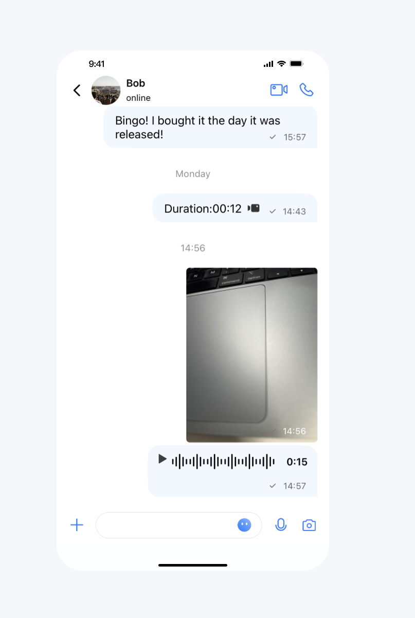 接下来,你可以在消息界面中向该用户发送消息、语音、图片、进行音视频通话了: