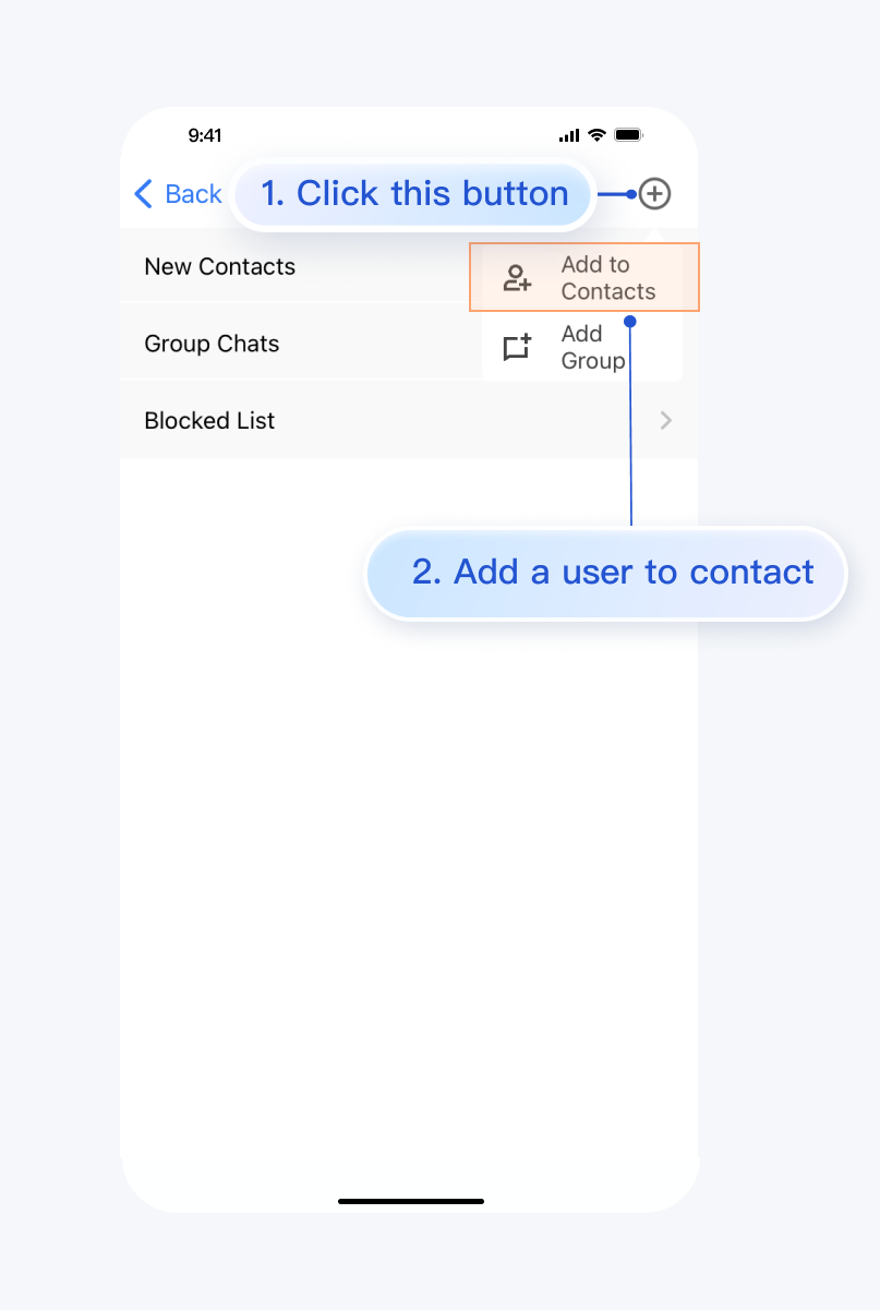 + 按钮,在子菜单中选择 Add to Contacts。2. 输入有效的 userID,搜索出用户。如果您已经在控制台上创建了账号,可以去控制台