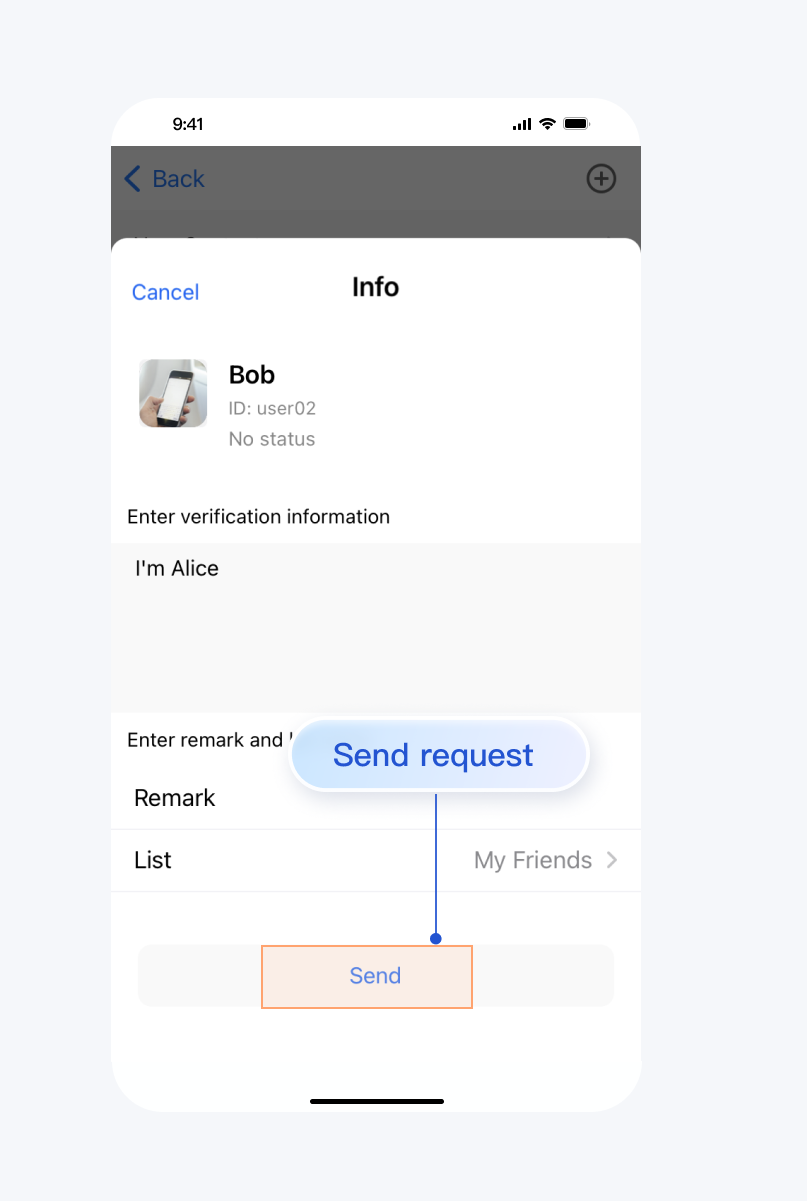 点击 Add to Contacts | 搜索用户 | 发送添加联系人请求 |