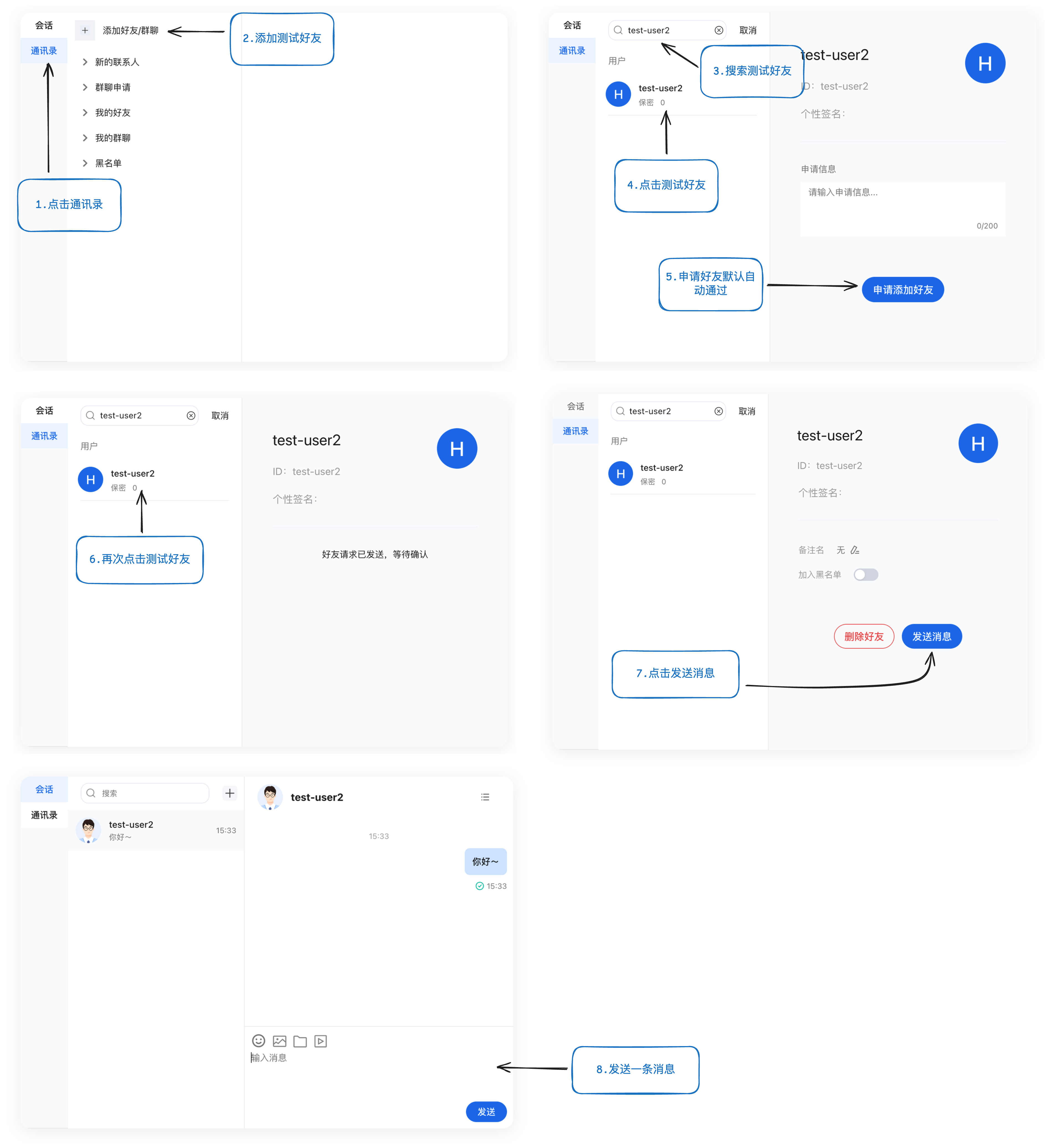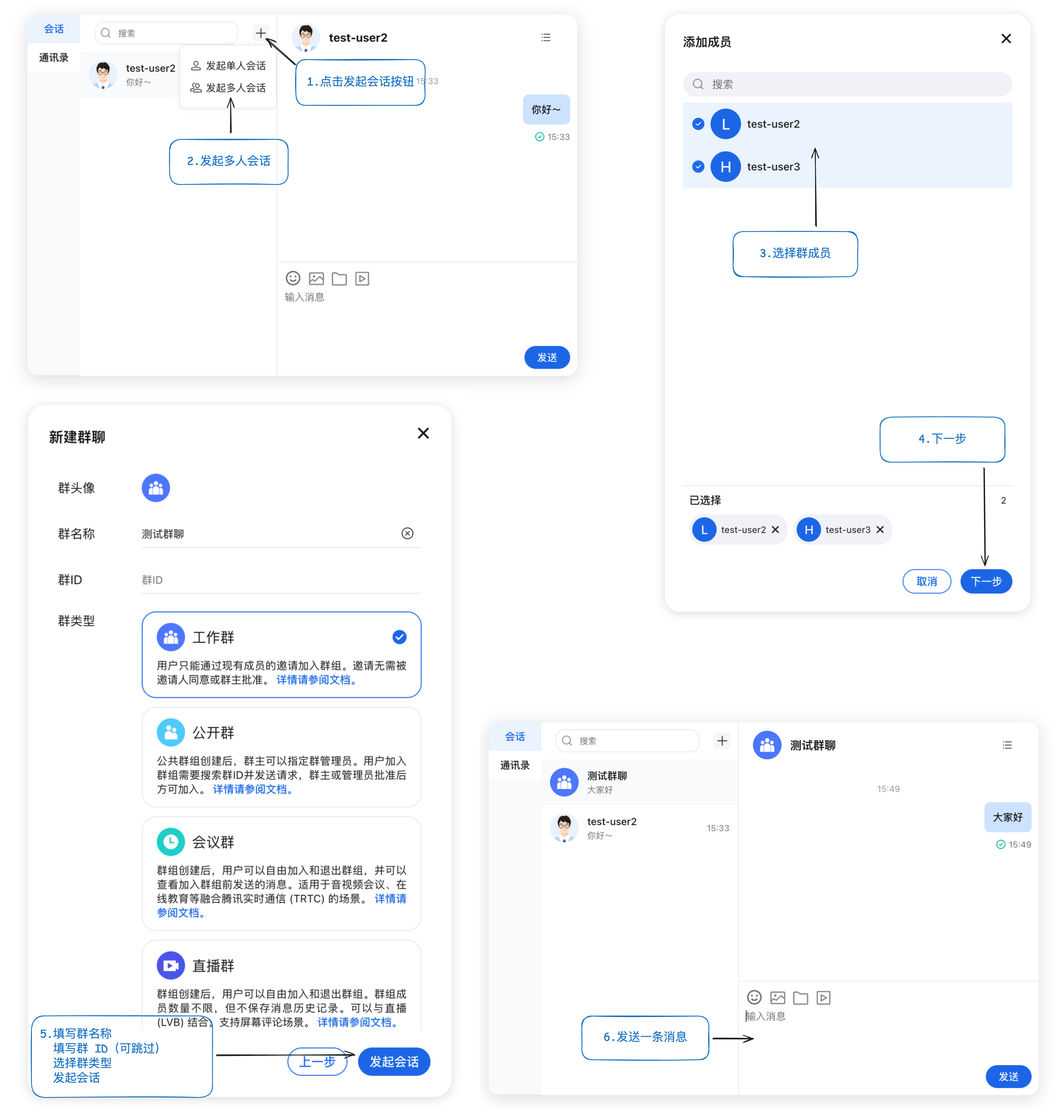 3. 进入用户管理页面,创建 2~3 个测试账号,用于体验单聊能力和群聊能力。
