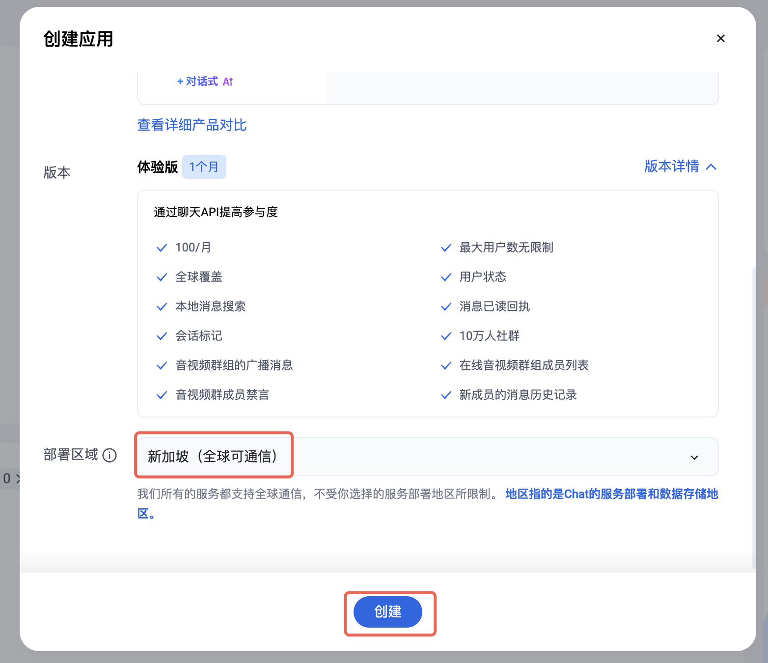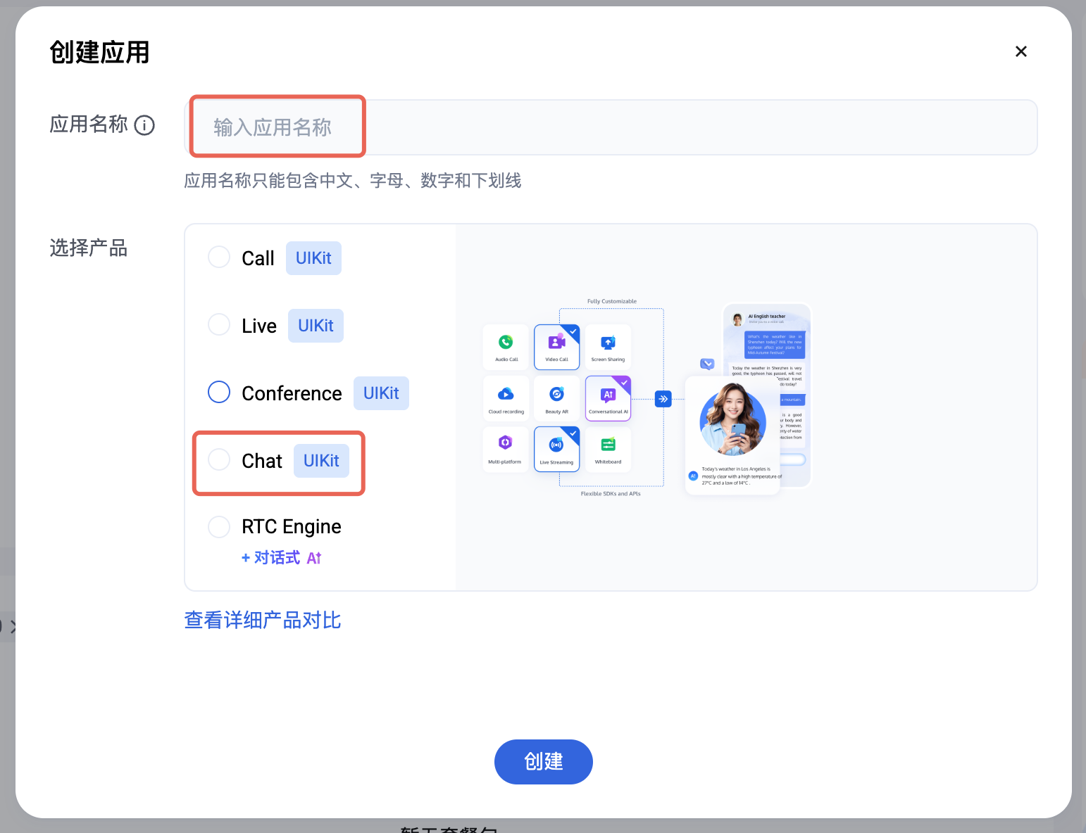 3. 在创建应用弹框中填入应用名称,选择产品为 Chat。