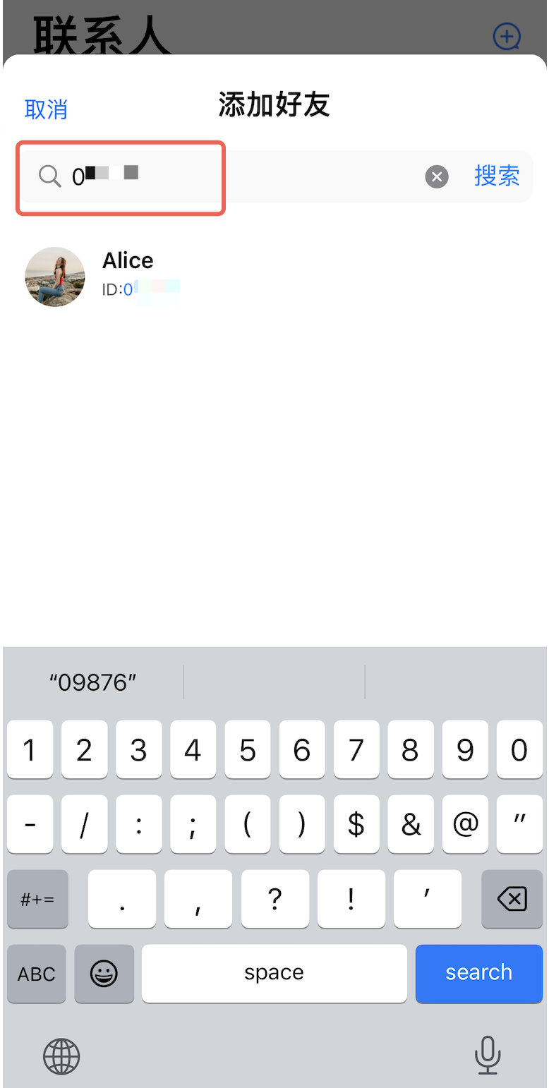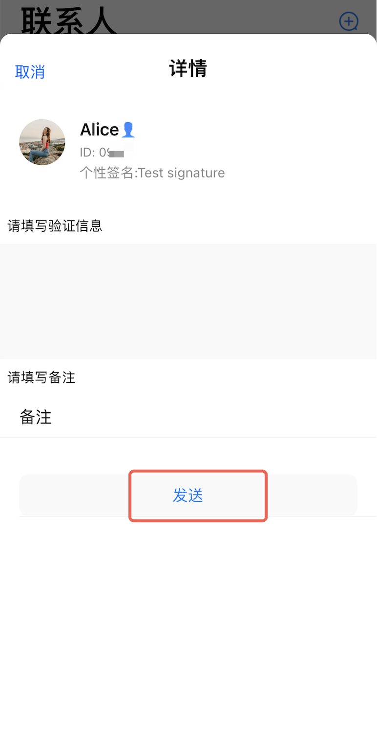 点击添加好友 | 输入 UserID 搜索用户 | 发送添加联系人请求 |
