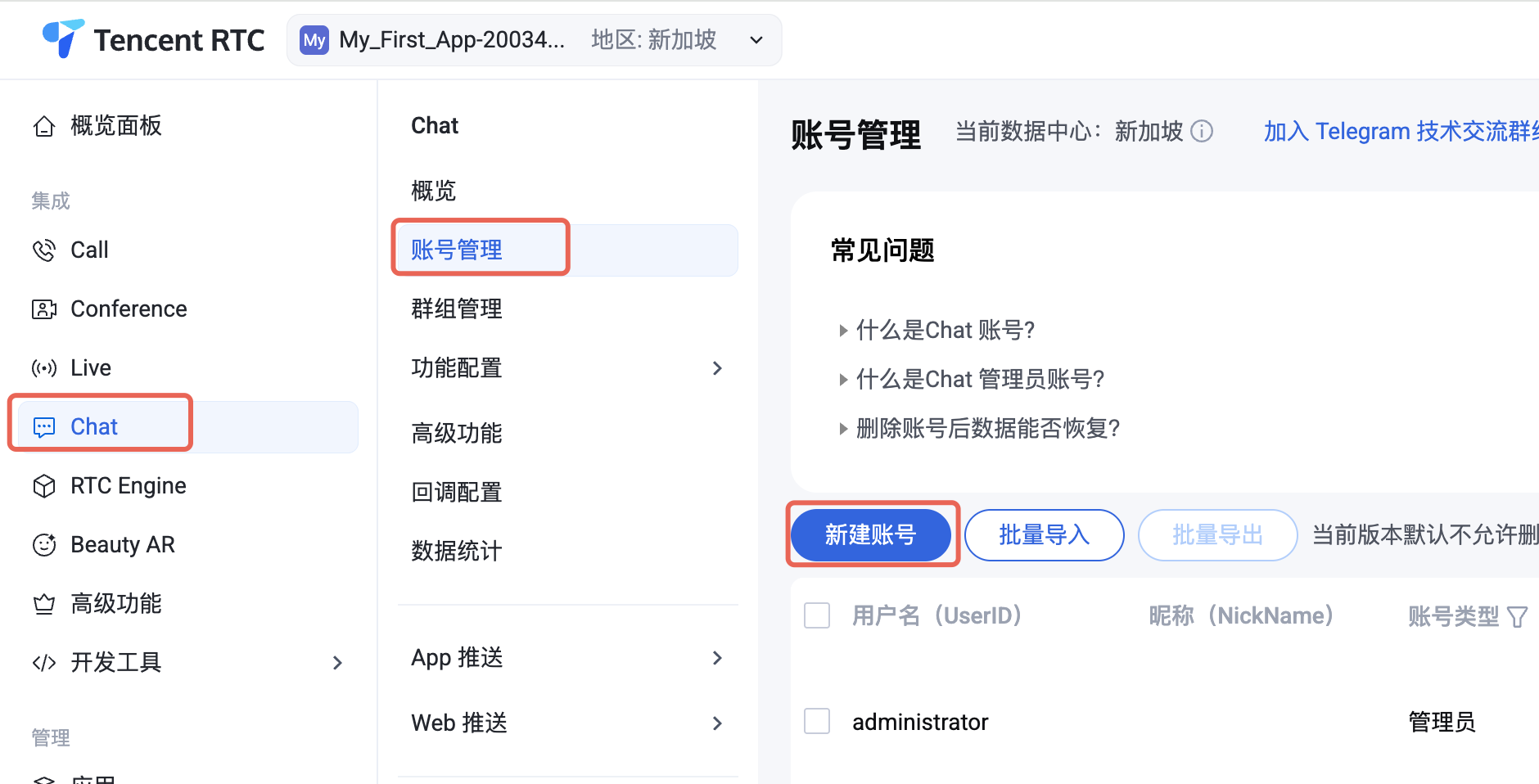 1. 进入 Chat > 账号管理 页面。