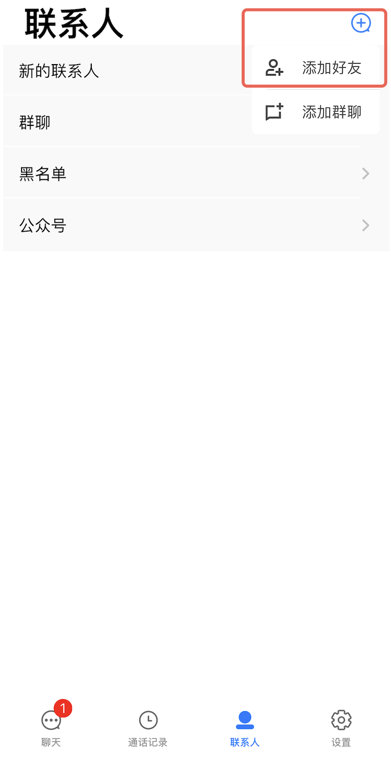 1. 点击该界面右上角的 + 按钮,在子菜单中选择添加好友。