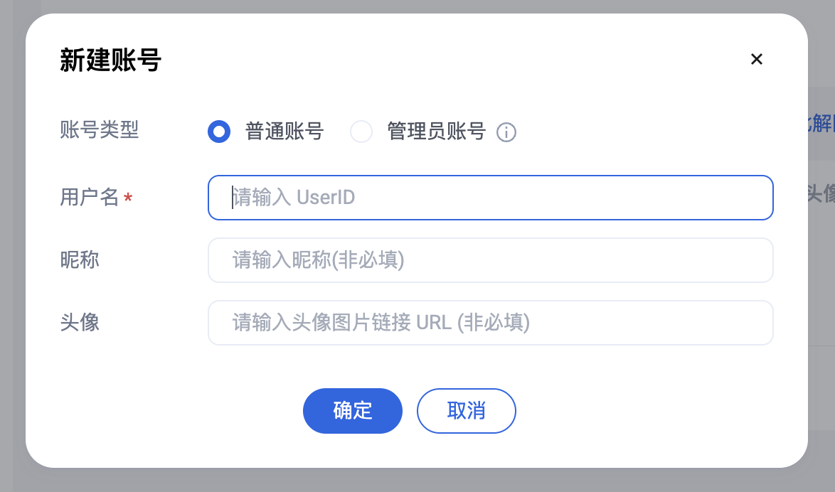 3. 如果只是普通成员,选择普通账号即可。我们建议设置昵称。界面上可以通过昵称展示不同用户。