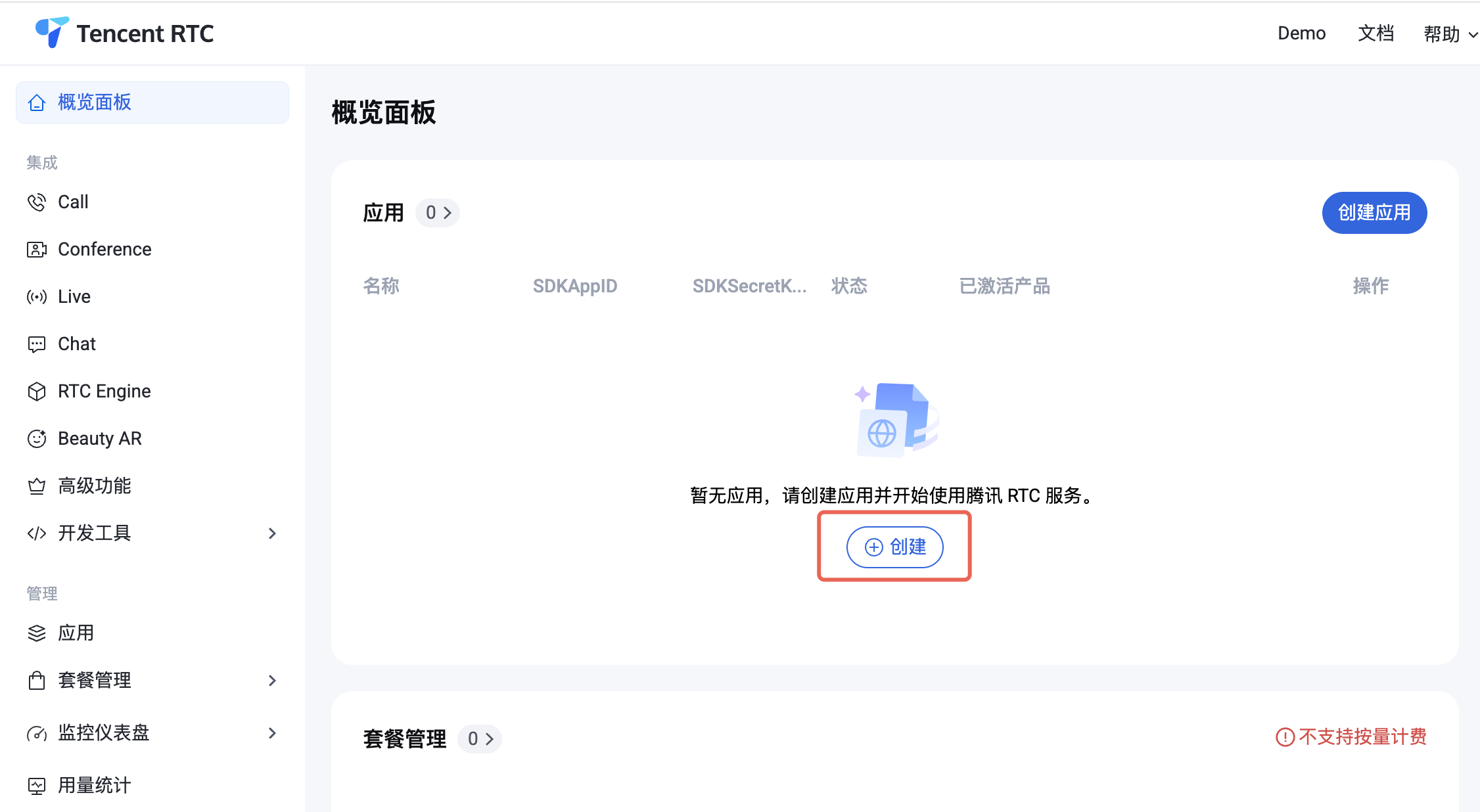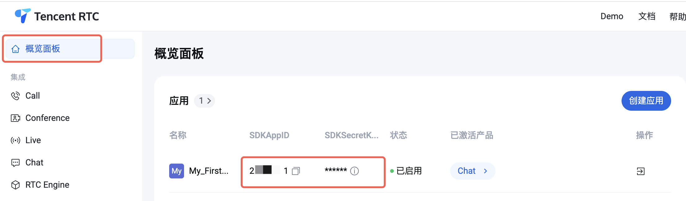 SDKAppID 及 SDKSecretKey 并直接跳转到下一节。2. 在概览面板单击创建,开始创建新应用。
