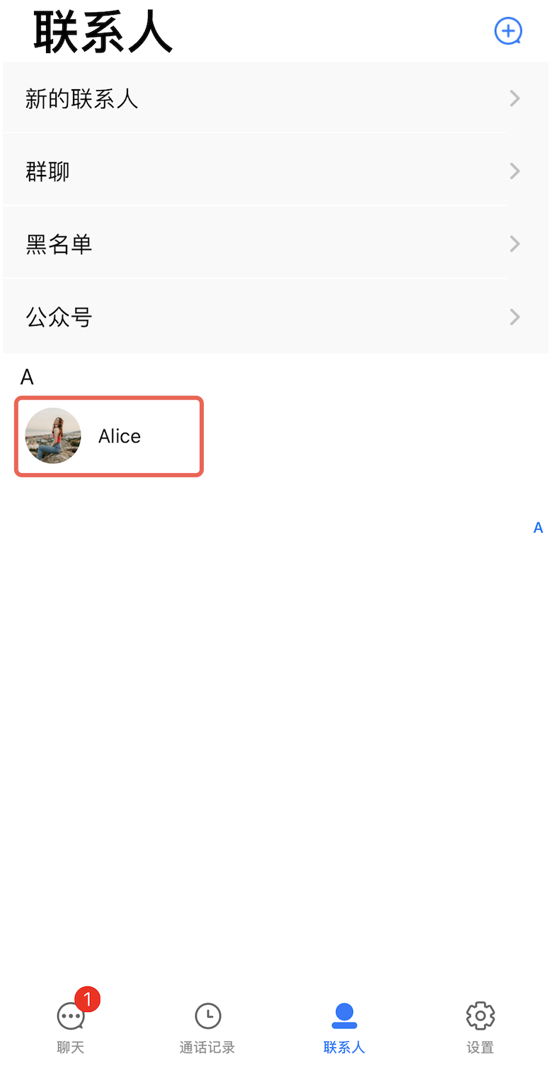 添加成功后,联系人列表会出现刚才的用户: