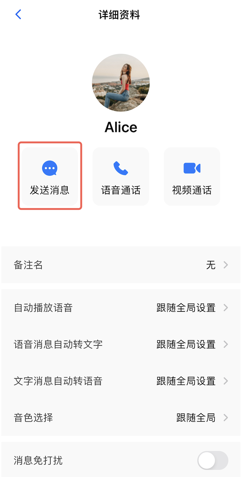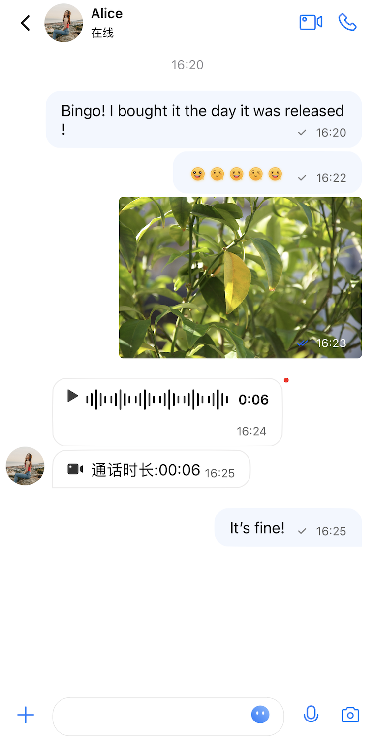接下来,你可以在消息界面中与该用户发送消息、语音、图片、进行音视频通话了: