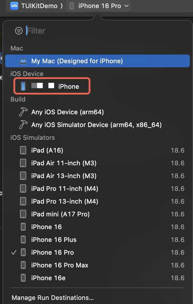 chat-uikit-ios-main/Demo 文件夹,打开TUIKitDemo.xcworkspace编译运行。以运行 iOS 设备为例: