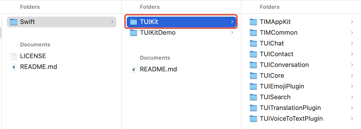 1. 从 GitHub 下载 TUIKit 源码,将 TUIKit 目录直接拖入您的工程目录下: