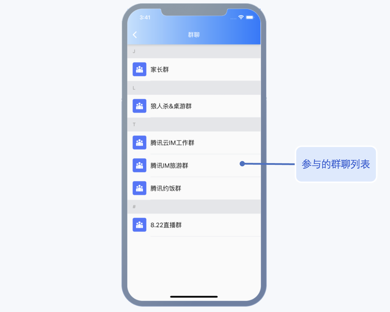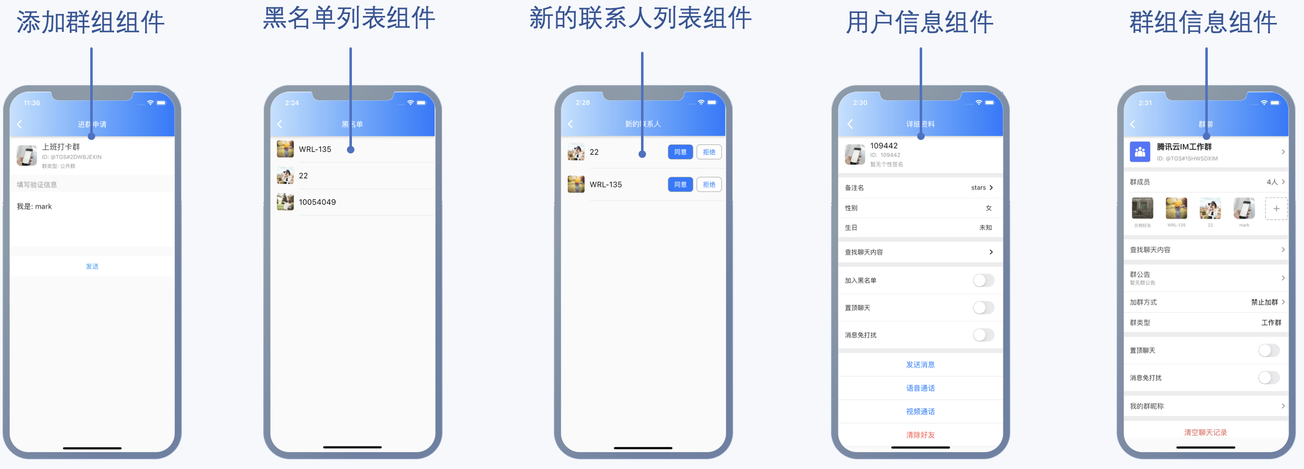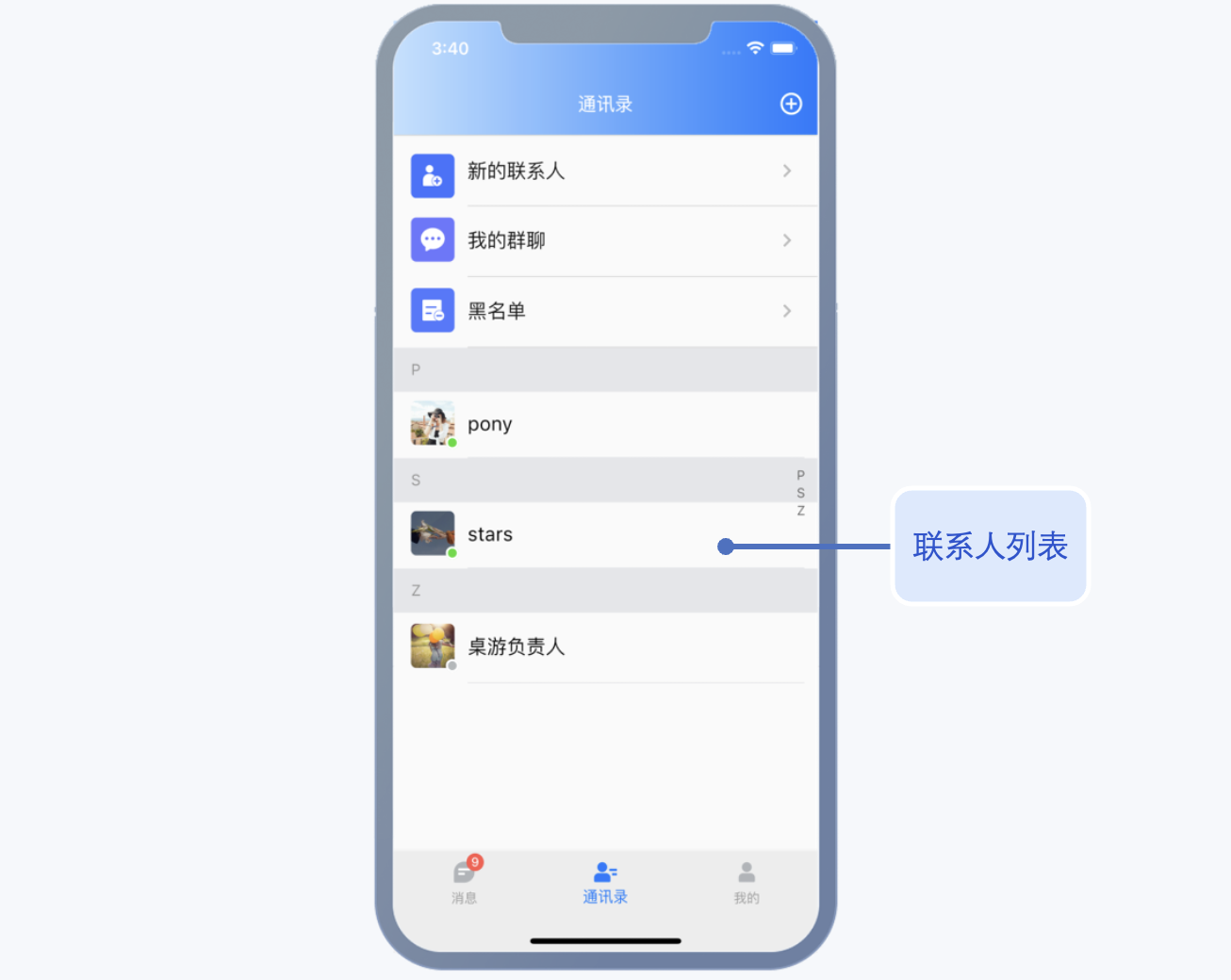 关系链主要负责当前用户的联系人、群聊、黑名单的信息展示。界面效果如下图所示: