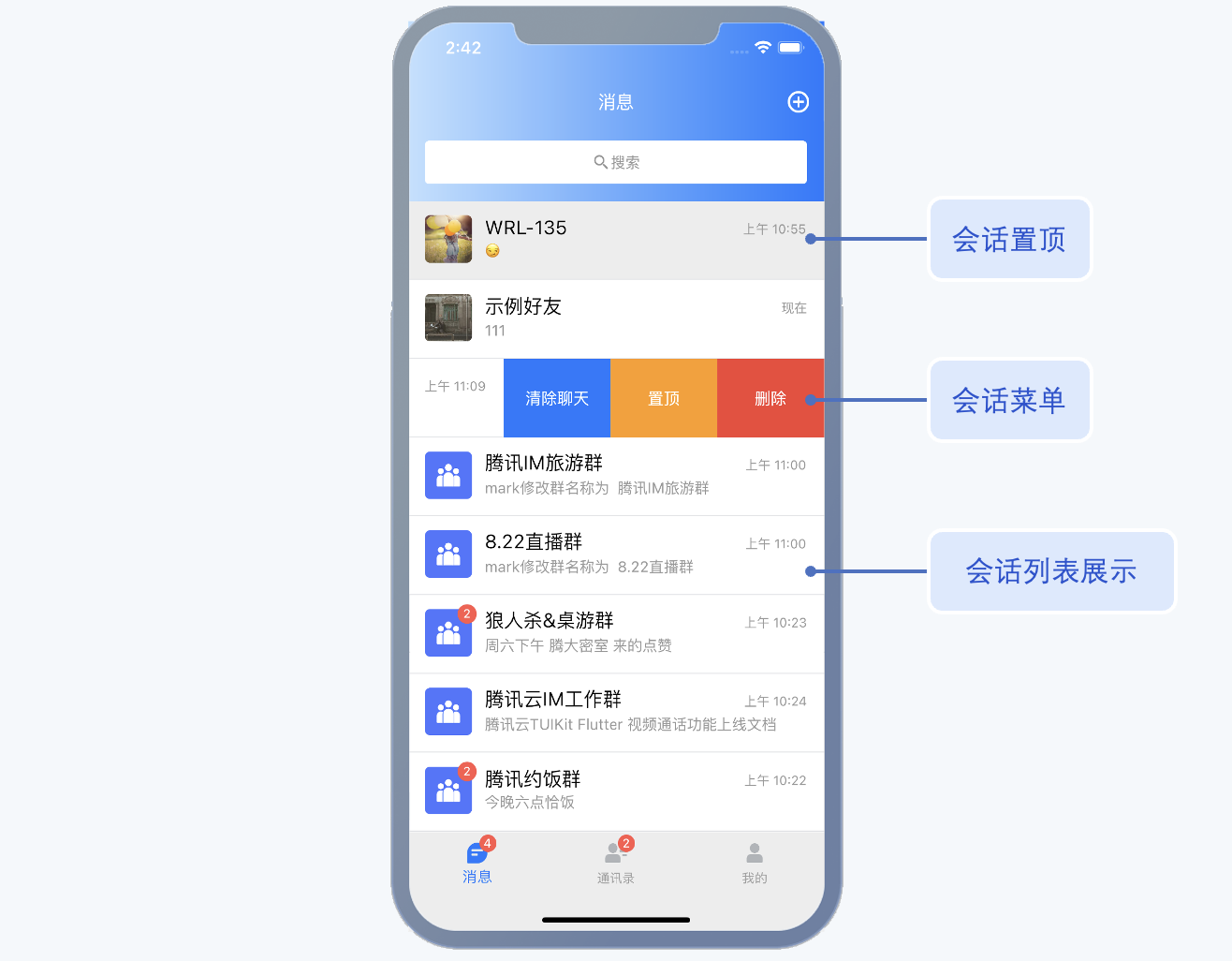 TIMUIKitConversation 主要负责会话列表的展示和编辑。界面效果如下图所示: