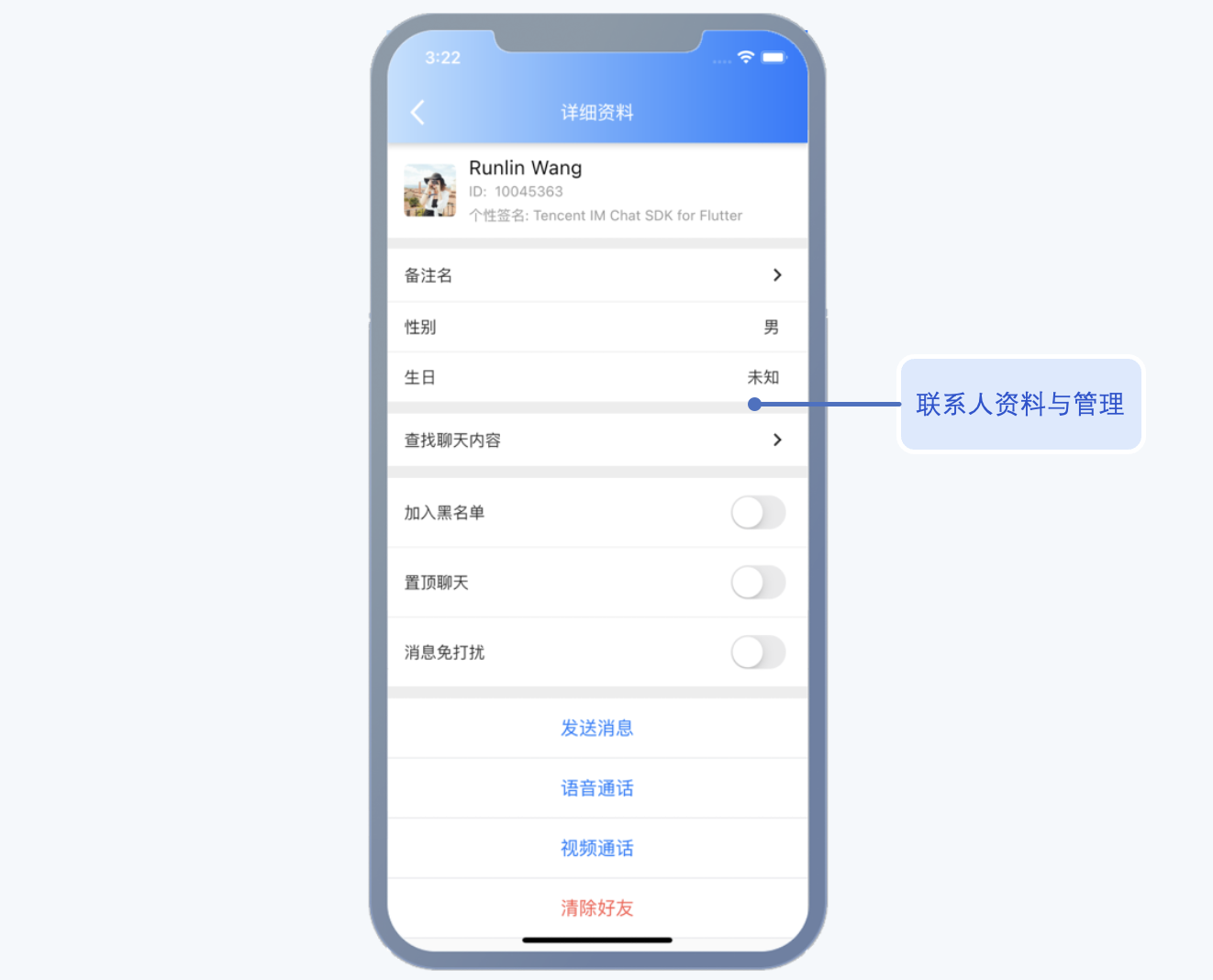 TIMUIKitProfile 主要负责联系人的资料展示与管理。界面效果如下图所示: