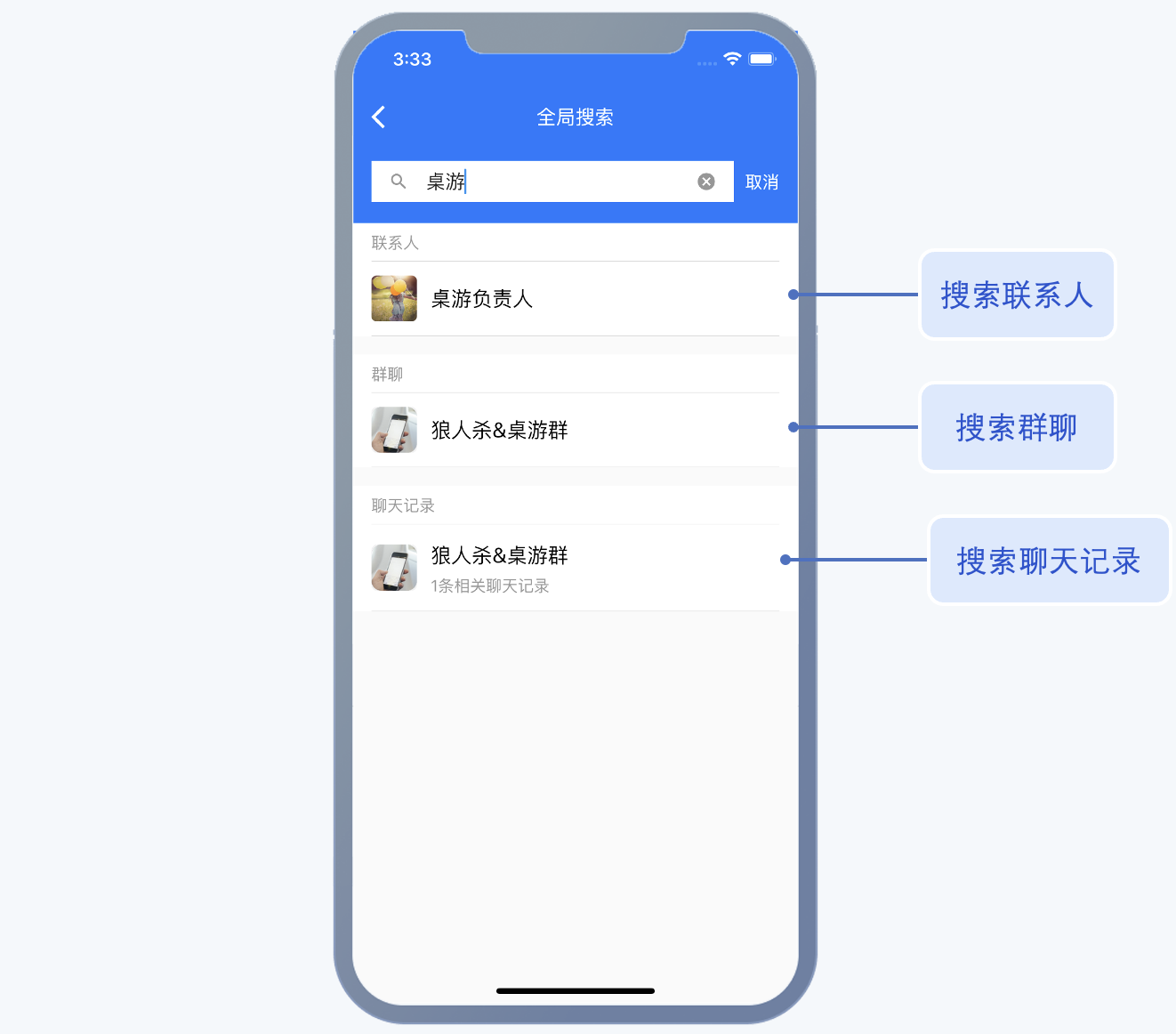 TIMUIKitSearch 为本地全局搜索,支持同时搜索联系人、群聊及聊天记录;TIMUIKitSearchMsgDetail 为会话内聊天历史记录搜索。