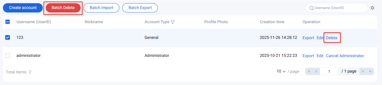 2. 在账号管理页面,在列表中选中需要删除的账号,单击批量删除。