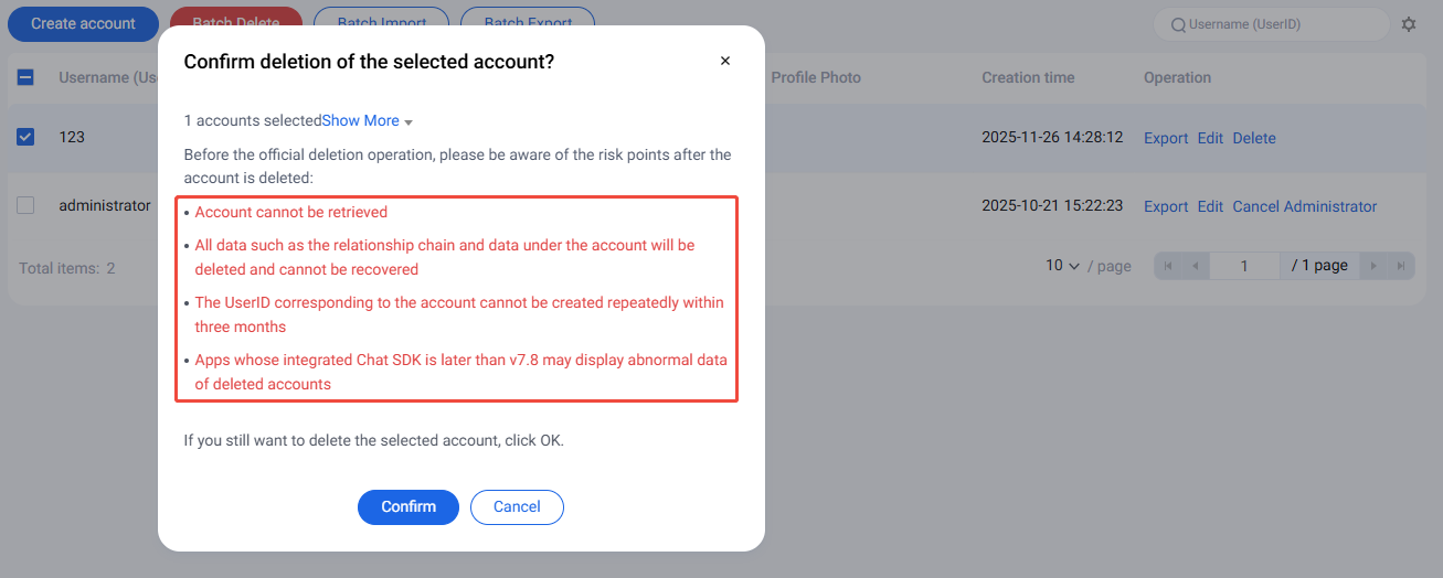 3. 在弹出的确认对话框中,了解相关风险后,点击确认删除账号。删除后数据无法恢复,请谨慎操作。