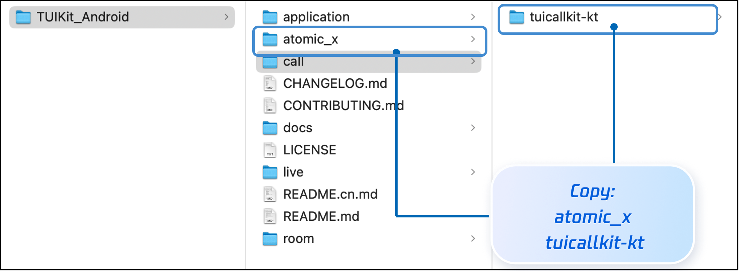 TUIKit_Android 目录下的 atomic_x 和 call 目录下的 tuicallkit-kt 子目录复制到您当前工程的 app 同级目录中,如下图所示。