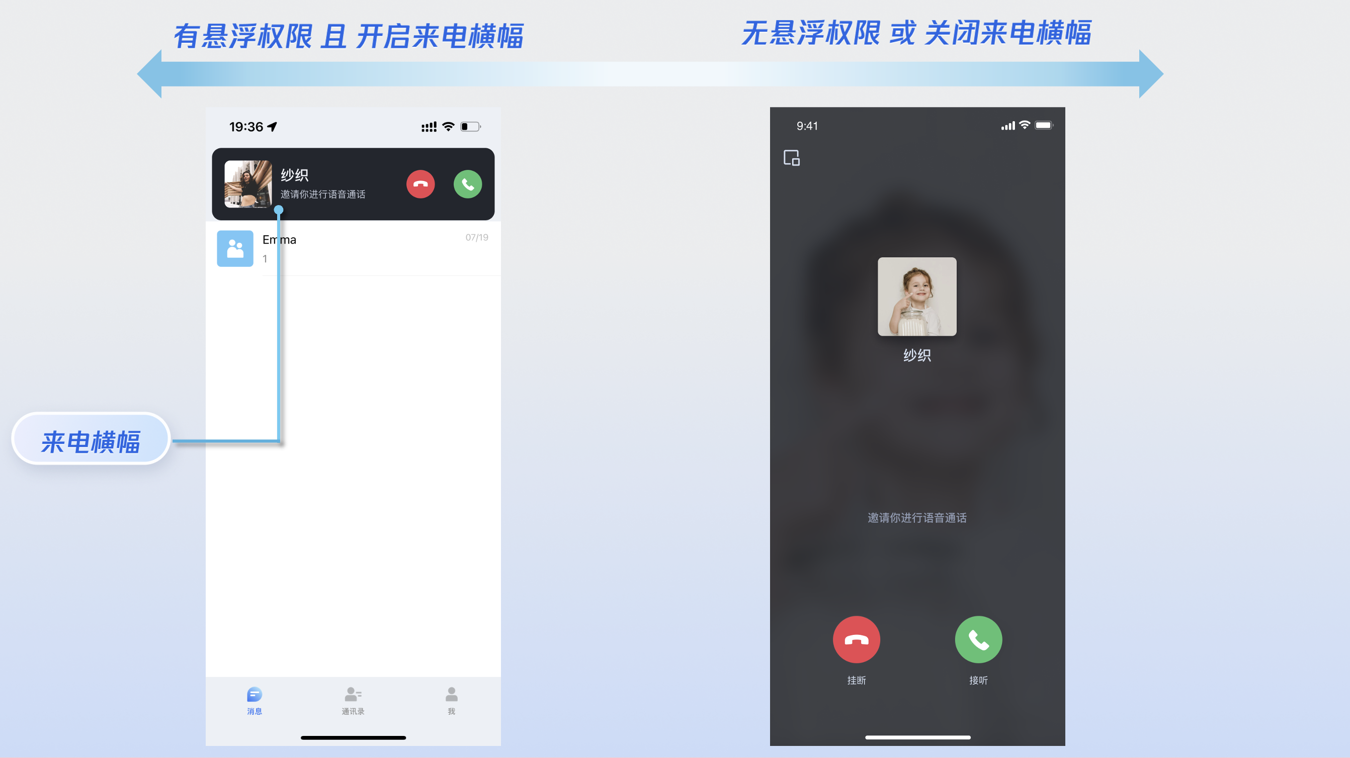您可以通过调用 enableIncomingBanner 开启/关闭来电横幅显示,该功能默认为关闭状态(false)。当被叫端收到来电时,默认展示全屏通话等待界面。启用此功能后,将首先显示一个横幅通知,然后根据需要切换到全屏通话界面。请注意,显示来电横幅需要授予悬浮权限,具体的显示策略将根据权限设置及应用当前是否在前台或后台运行来决定,具体策略可参考:被叫端来电显示策略。