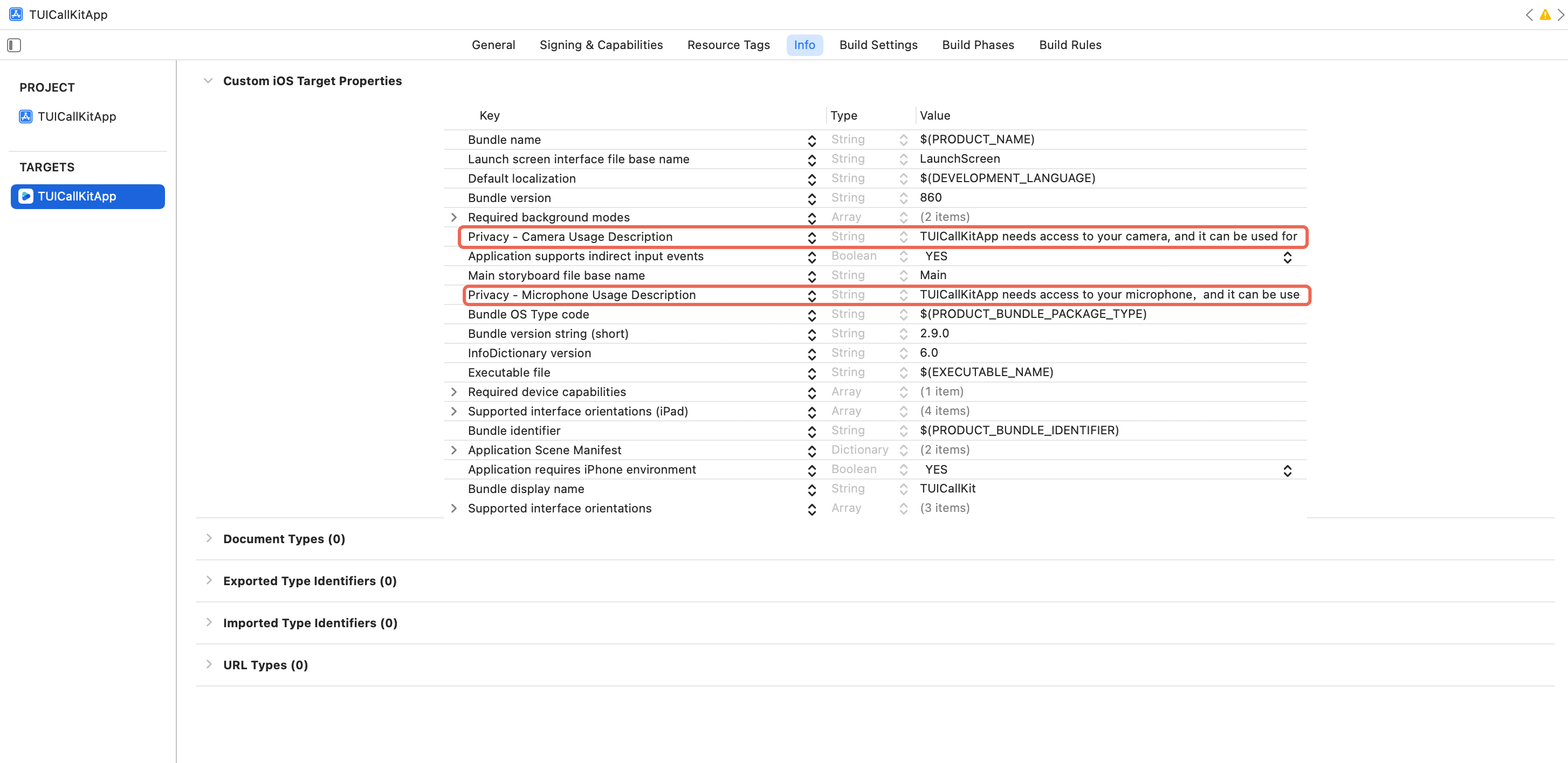 Info.plist 文件中添加以下两项,并填写对应的使用说明,这些说明将在系统请求权限时向用户显示:<key>NSCameraUsageDescription</key><string>TUICallKitApp 需要访问您的摄像头,并可用于视频通话、群组视频通话等功能。</string><key>NSMicrophoneUsageDescription</key><string>TUICallKitApp 需要访问您的麦克风,并可用于音频通话、群组音频通话、视频通话、群组视频通话等功能</string>