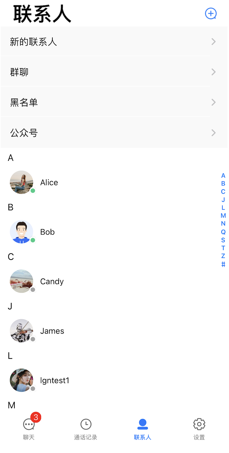 开启“显示用户在线状态” 后,会在会话列表和联系人列表的用户头像上显示用户的在线状态。当绿圈出现时表示对方在线,没有绿圈则表示对方当前离线。