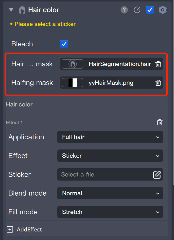 添加染发对象后,组件默认开启一个染发效果,染发效果可以重复添加和删除。