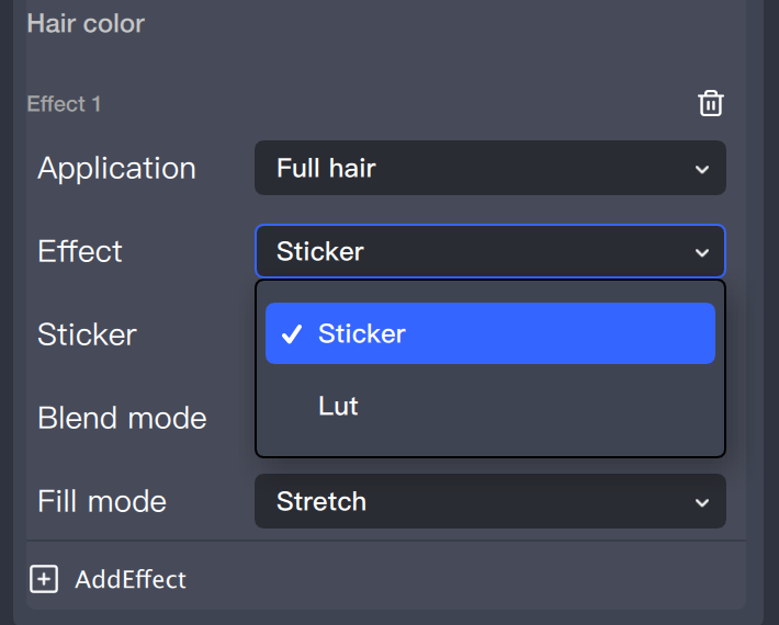 染发效果分为贴纸和 Lut 两种。