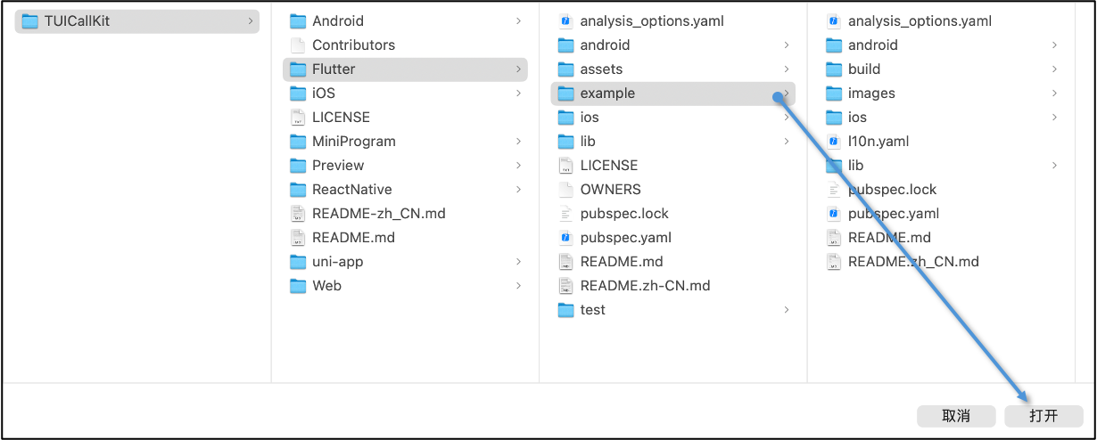 2. 通过 Android Studio 或 VSCode 打开 TUICallKit Flutter 的 example 。以下流程将以 Android Studio 为例: