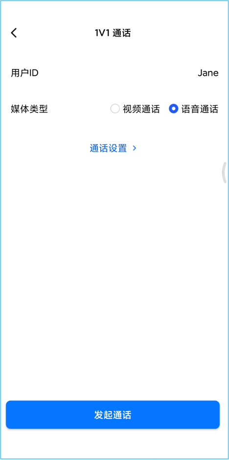 1. 主叫方请点击界面上的 1V1 通话,在弹出的界面中输入被叫方的 UserID 并选择您想要的通话类型。