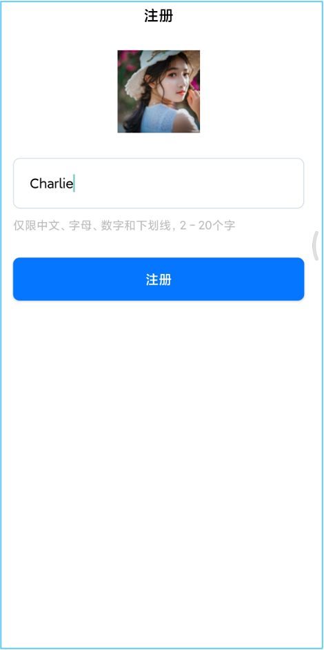 用户ID处输入 ID 。如果您当前的 UserID 未曾注册过,会进入到注册界面,您可以在该界面为自己设置昵称。登录用户:Charlie | | 登录用户:Jane | |
