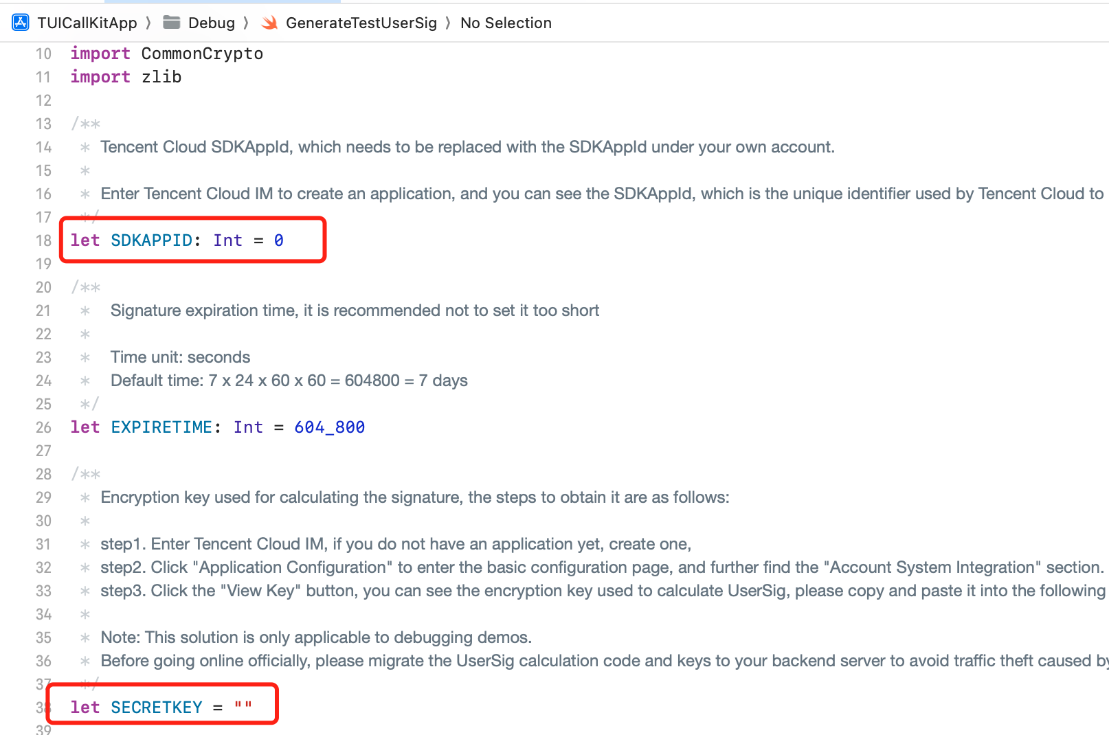 /iOS/Example/Debug/GenerateTestUserSig.swift文件,将 开通服务 时获取到的对应的 SDKAppID 和 SDKSecretKey填入其中: