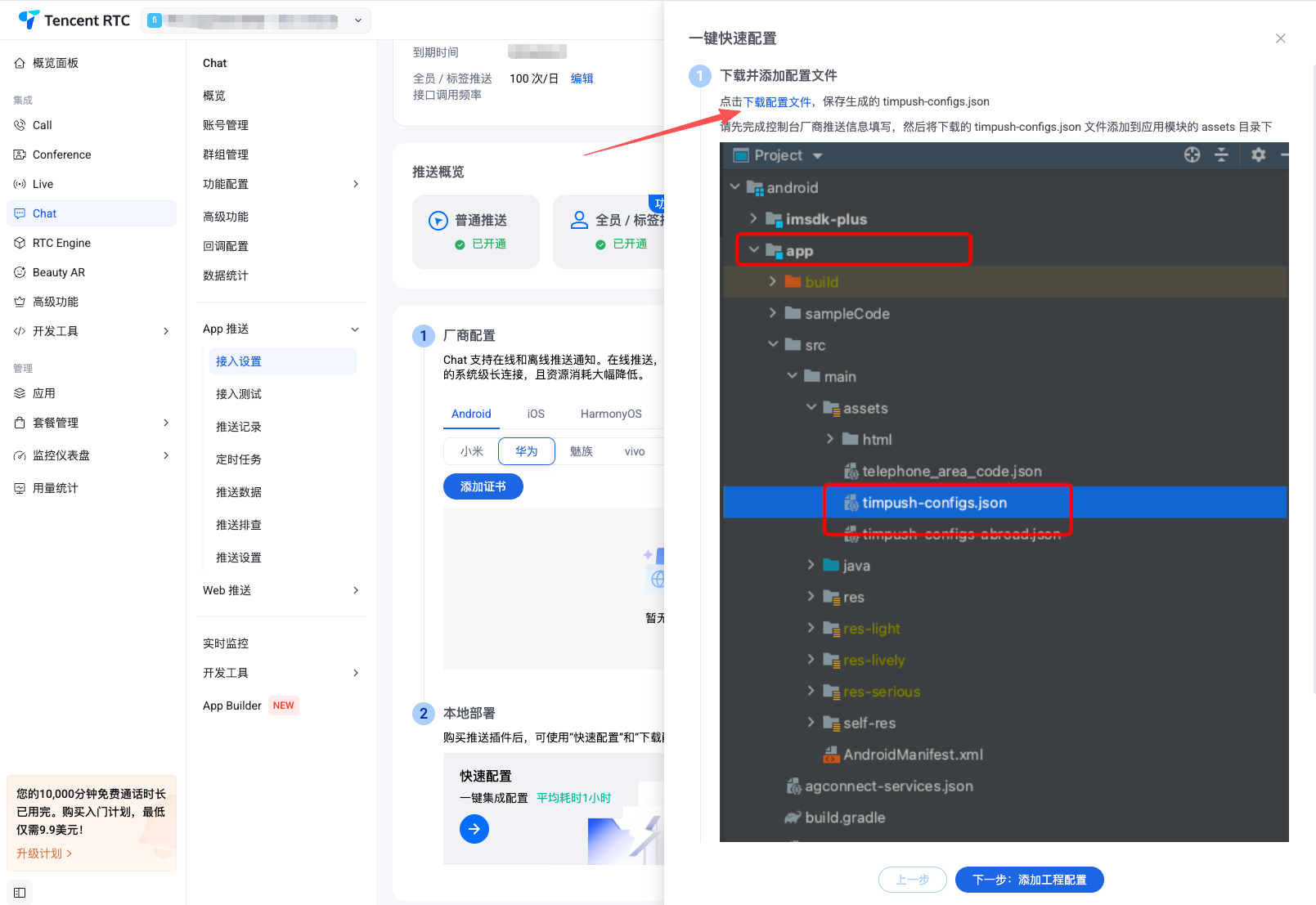 1.选择下载配置文件 timpush-configs.json | 2.添加到工程 |