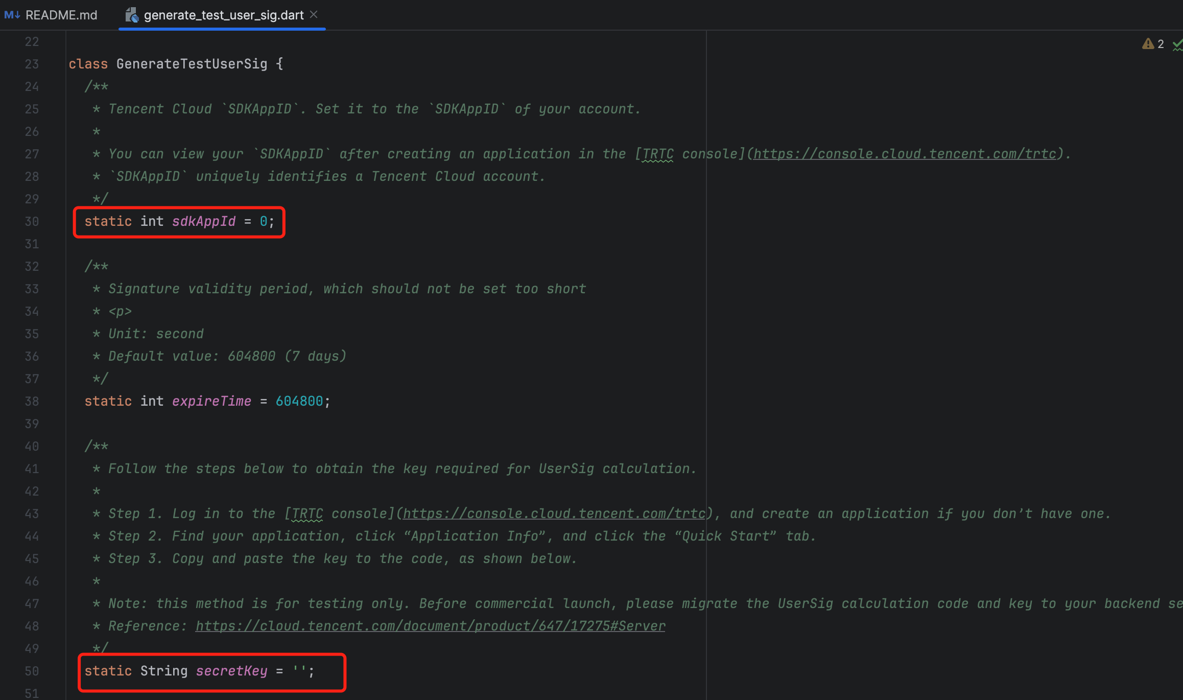 SDKAppID 和 SDKSecretKey:在 livekit 工程中,将获取的 SDKAppID 和 SDKSecretKey 填入example/lib/debug/generate_test_user_sig.dart文件:
