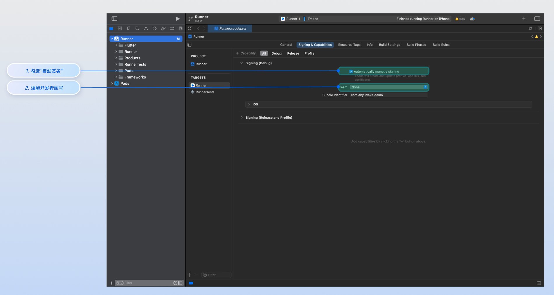 UserSig,在需要 UserSig 时由您的 App 向业务服务器发起请求获取动态 UserSig 来进行鉴权。详见 服务端生成 UserSig。配置苹果开发者签名:在项目 TARGETS 下的 Signing & Capabilities 界面勾选 Automatically manage signing,配置您的苹果开发者账号和 Bundle Identifier: