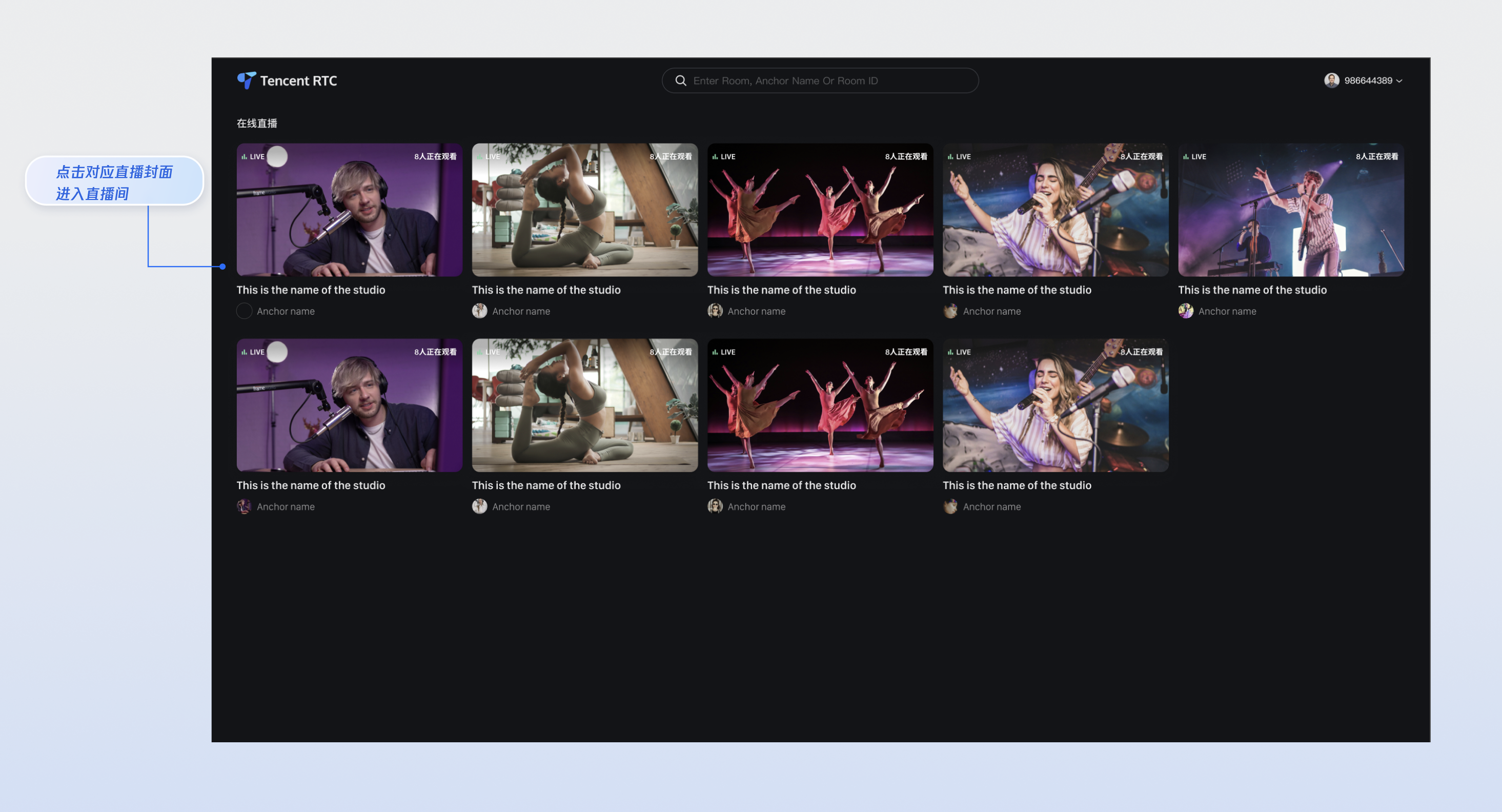首次运行项目后,您需要输入对应的 userId 进行身份标识记录,后续再次运行项目就会直接显示直播列表页面,如图所示为直播列表页面。