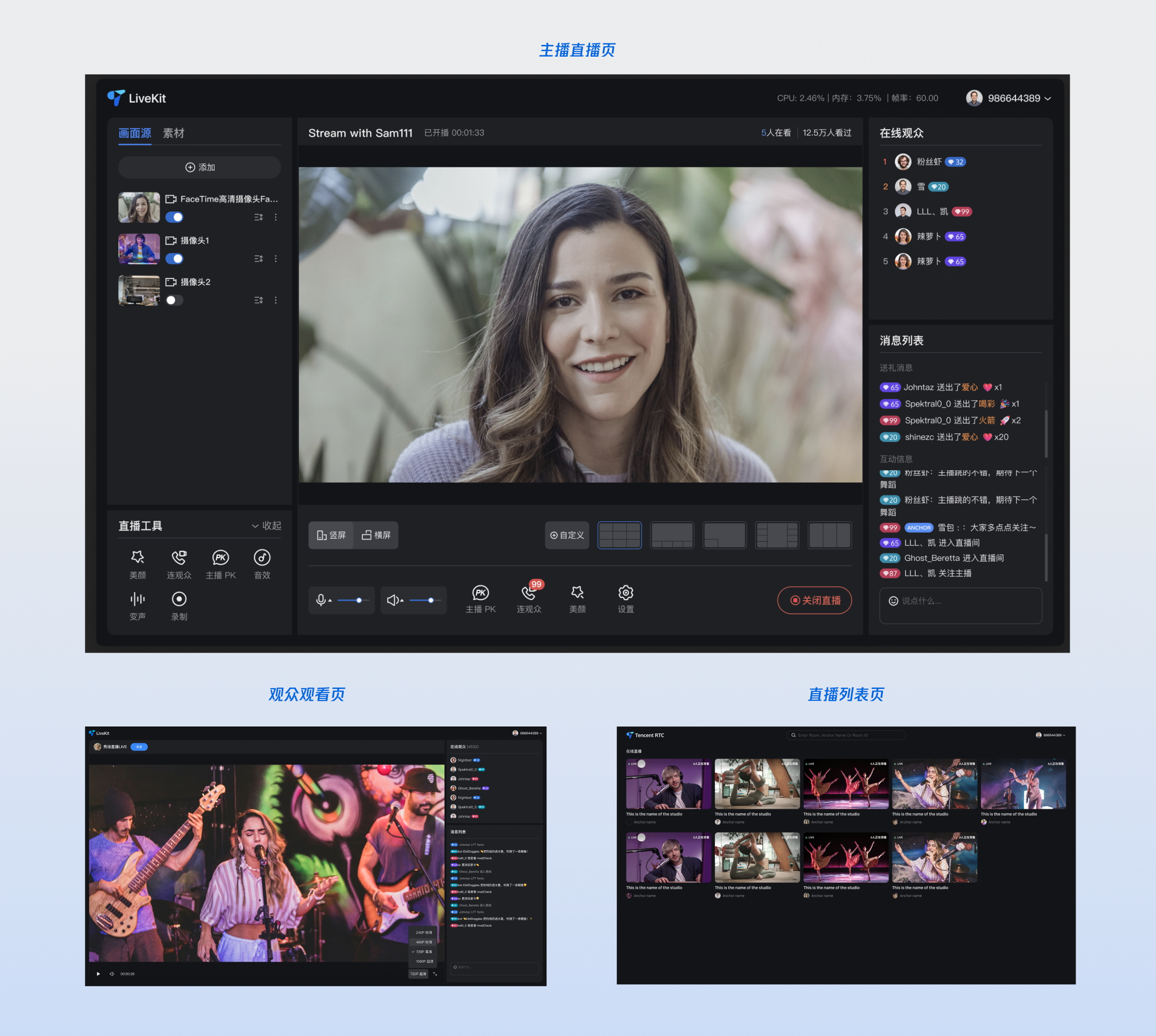 不同观众可以同时进行发送弹幕、关注主播、申请连麦等操作,实现真实的多人互动场景。