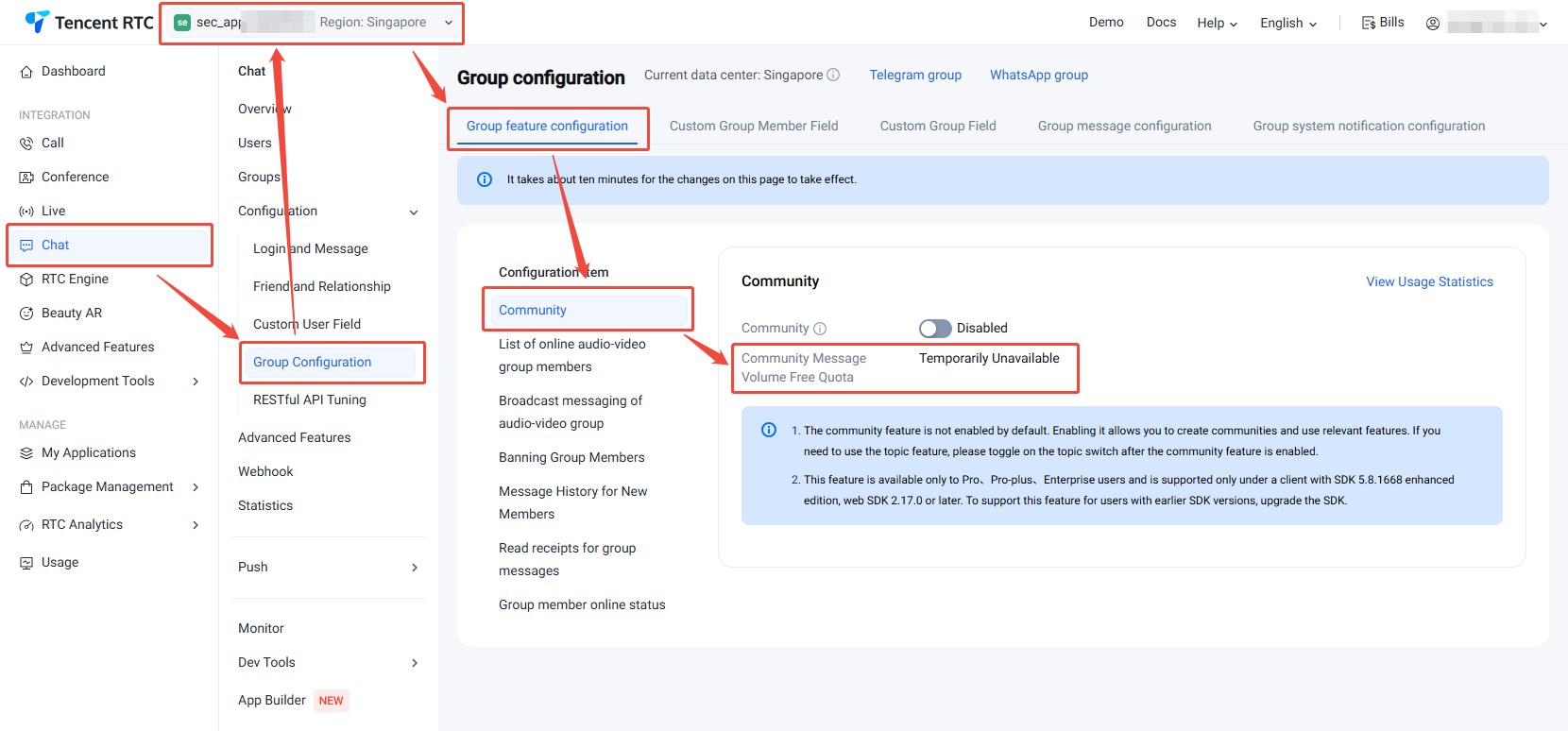 针对目前 Chat 包月套餐包赠送 的社群下行消息量,可前往 即时通信 Chat 控制台,在左侧导航栏选择 Chat > Configuration > Group Configuration,在顶部选择目标应用Group feature configuration > Community 下进行查看。