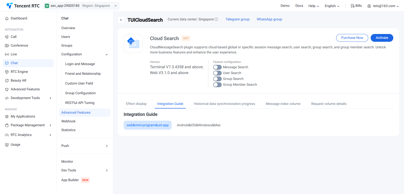 针对云端搜索、语音转文字等插件开通后,赠送的用量查看,可前往 即时通信 Chat 控制台,左侧导航栏选择 Chat > Advanced Features,在顶部选择目标应用,点击任意插件卡片,进入插件详情进行查看