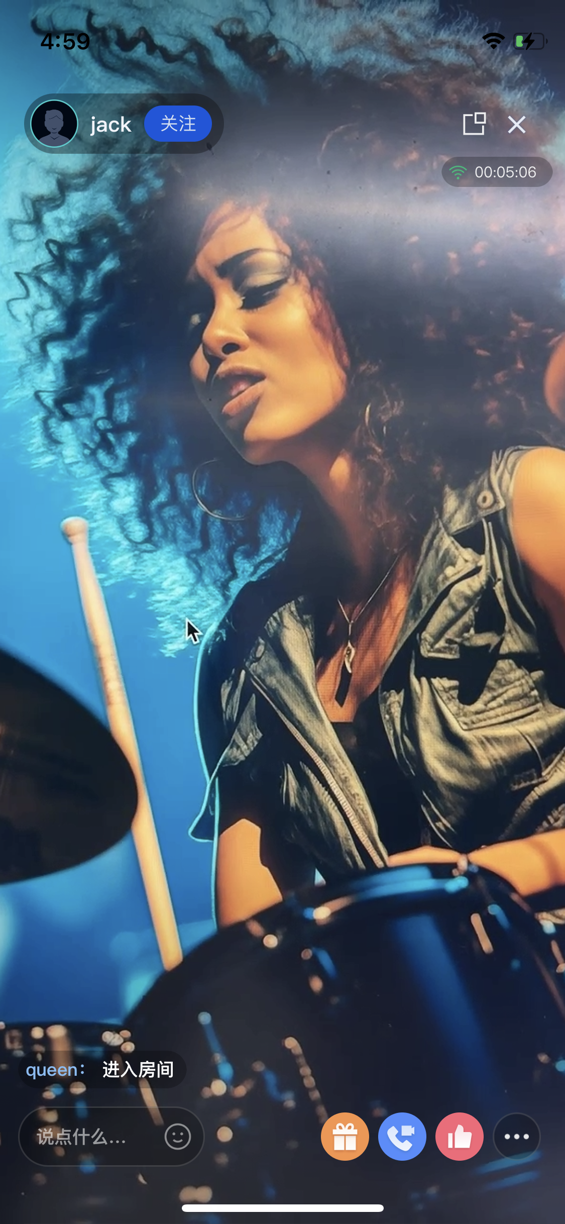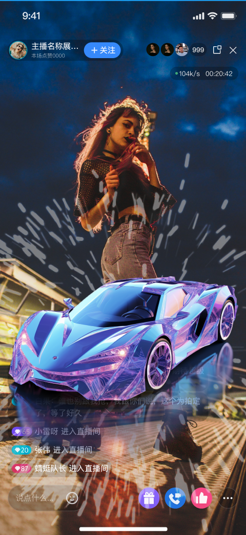 直播互动:送礼物(有动画特效,主播接收提示)、点赞(有动画及实时统计)、发弹幕互动。